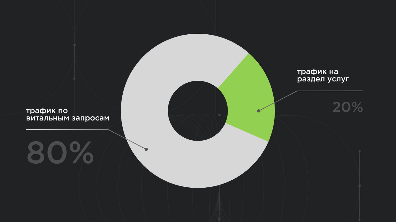 Анализ воронки показал: большинство заявок шло по витальным запросам, а раздел «Услуги» давал в 4 раза меньше заявок, чем общий трафик сайта.