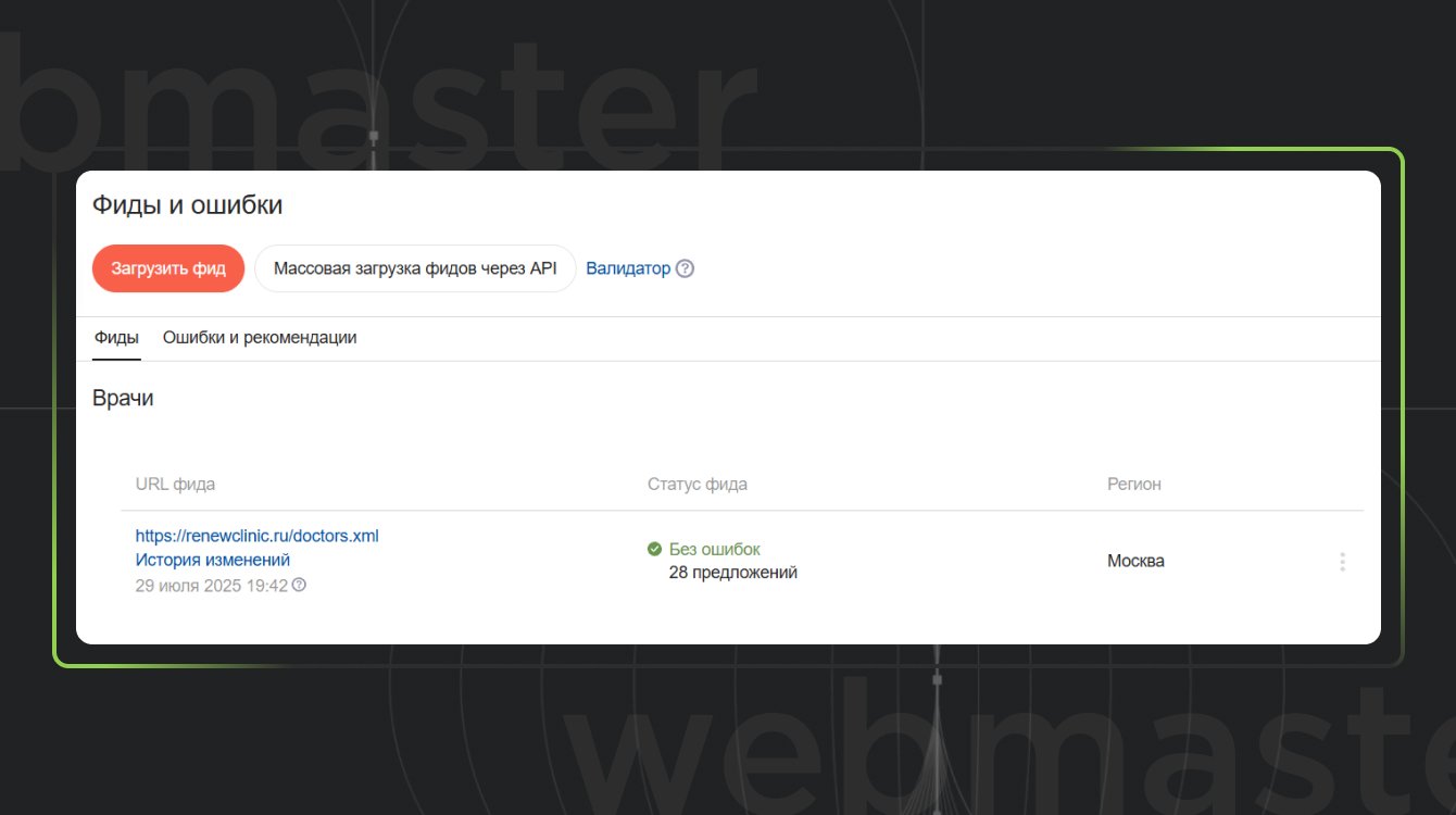 • Загрузили фид в Яндекс.Вебмастер и прошли модерацию.