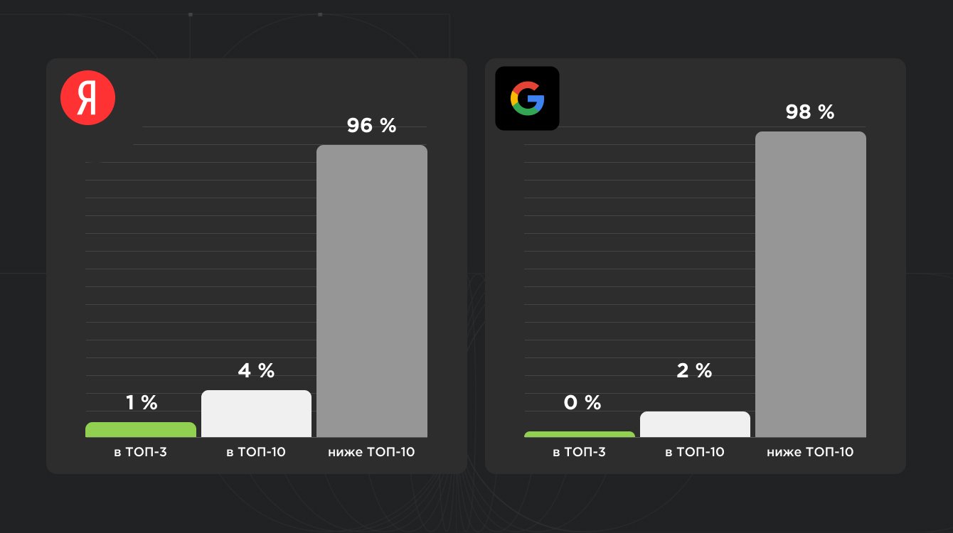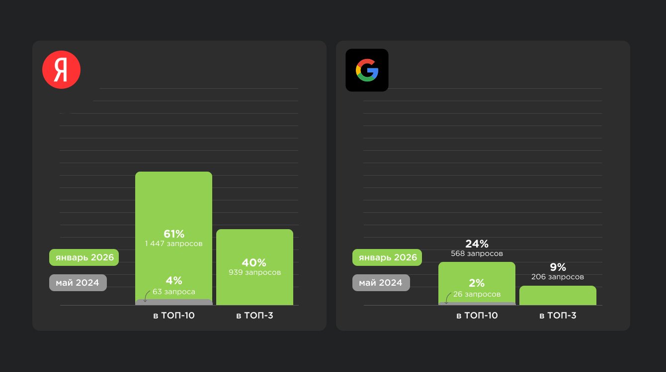• Google: май 2024 – 26 запросов в ТОП-10 (2%); январь 2026 – 568 в ТОП-10 (24%), 206 в ТОП-3 (9%).