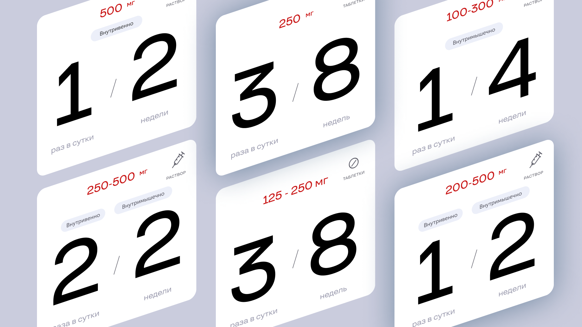 Для этого раздела были созданы наглядные схемы терапии для каждого диагноза с частотой применения в зависимости от формы и дозировки.