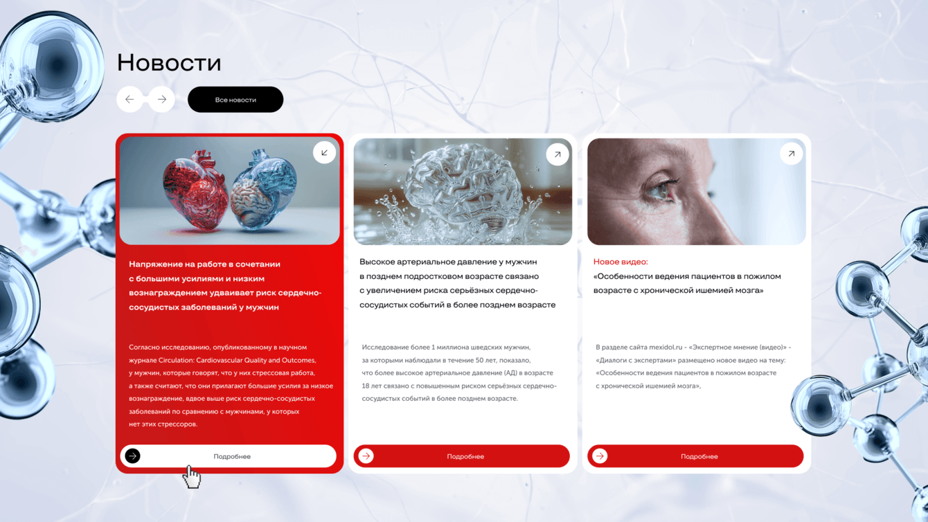 Сложность разработки заключалась в массивной научной базе данных бренда. Приходилось работать с двумя массивами: видео и статьи на медицинскую тематику. Именно поэтому нужно было пересмотреть подход в отображении интерфейса, сделать выдачу материалов более понятной, внедрить новые фильтры, а сам дизайн сделать удобным для восприятия.