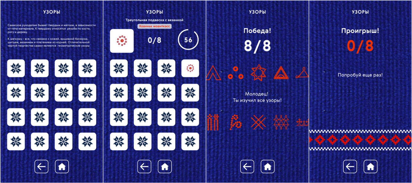 Необходимо было спроектировать интерфейс и создать игру на основании материалов, выданных музеем (фото изделий, видео мастер-классов, страницы книг)