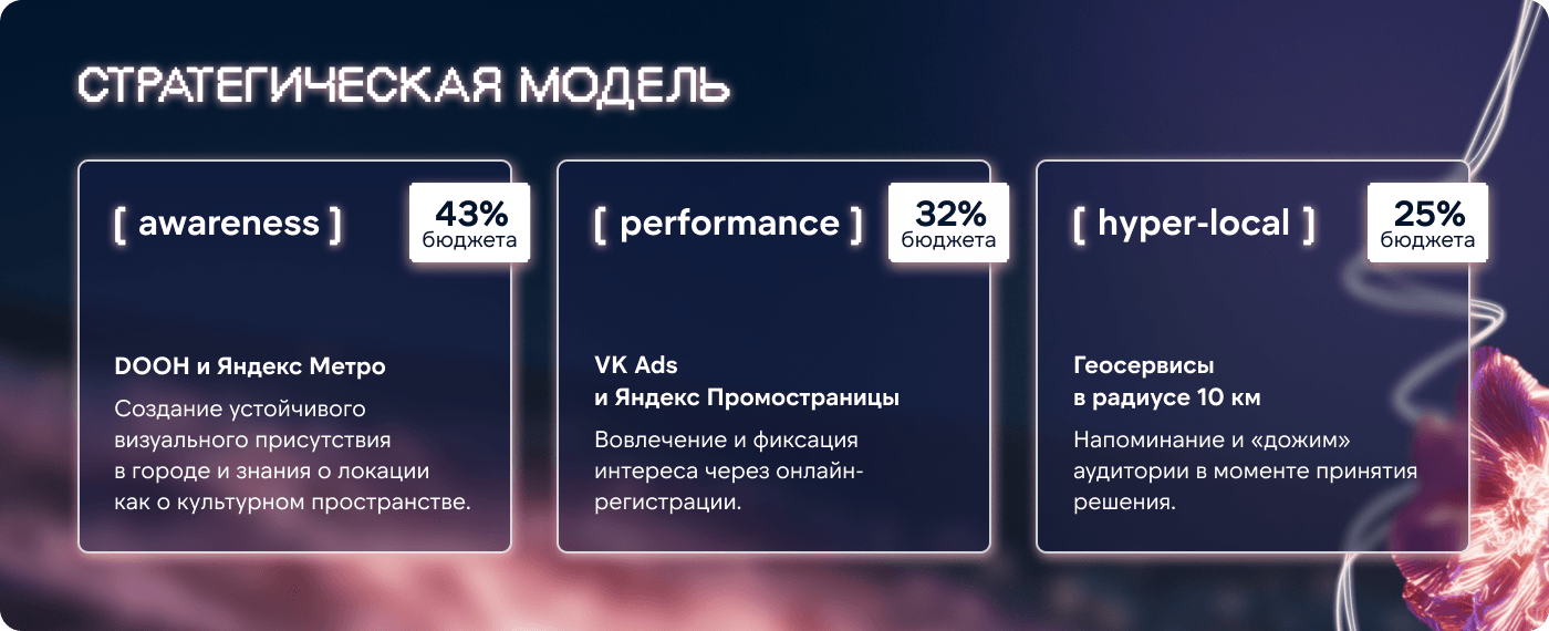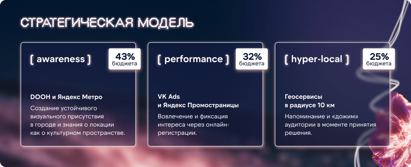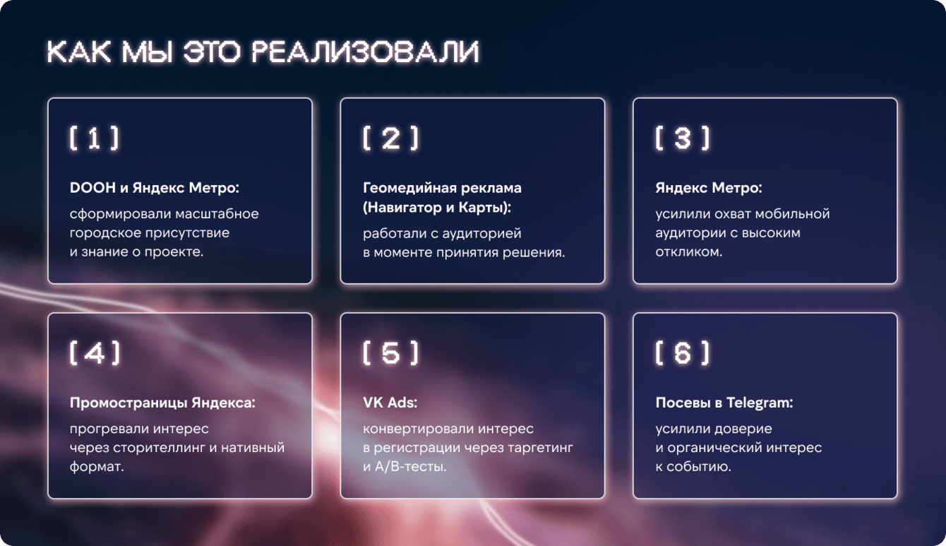 Почему такая структура: охватные форматы создают знание и намерение посетить локацию, а performance-каналы фиксируют интерес через регистрацию. Дальше мы управляли системой как единой воронкой: «контакт с событием → намерение → подтверждение через регистрацию → визит».