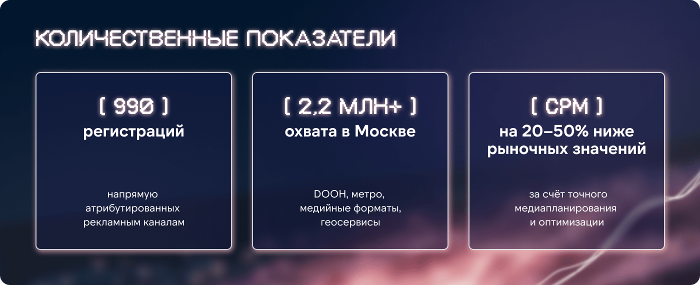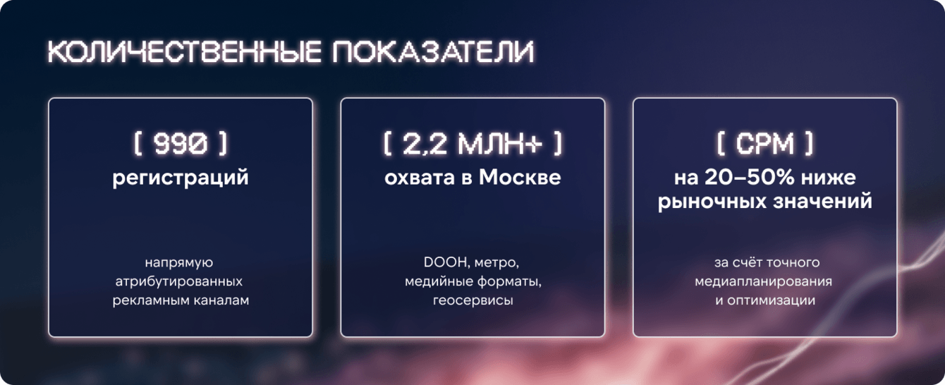 Что важно для интерпретации цифр: в этом проекте охват был не самоцелью, а верхом воронки, которая конвертировалась в регистрацию и дальше — в визит. Поэтому ключевые метрики мы читали как связку: «массовое знание → фиксируемый интерес → физическое посещение».