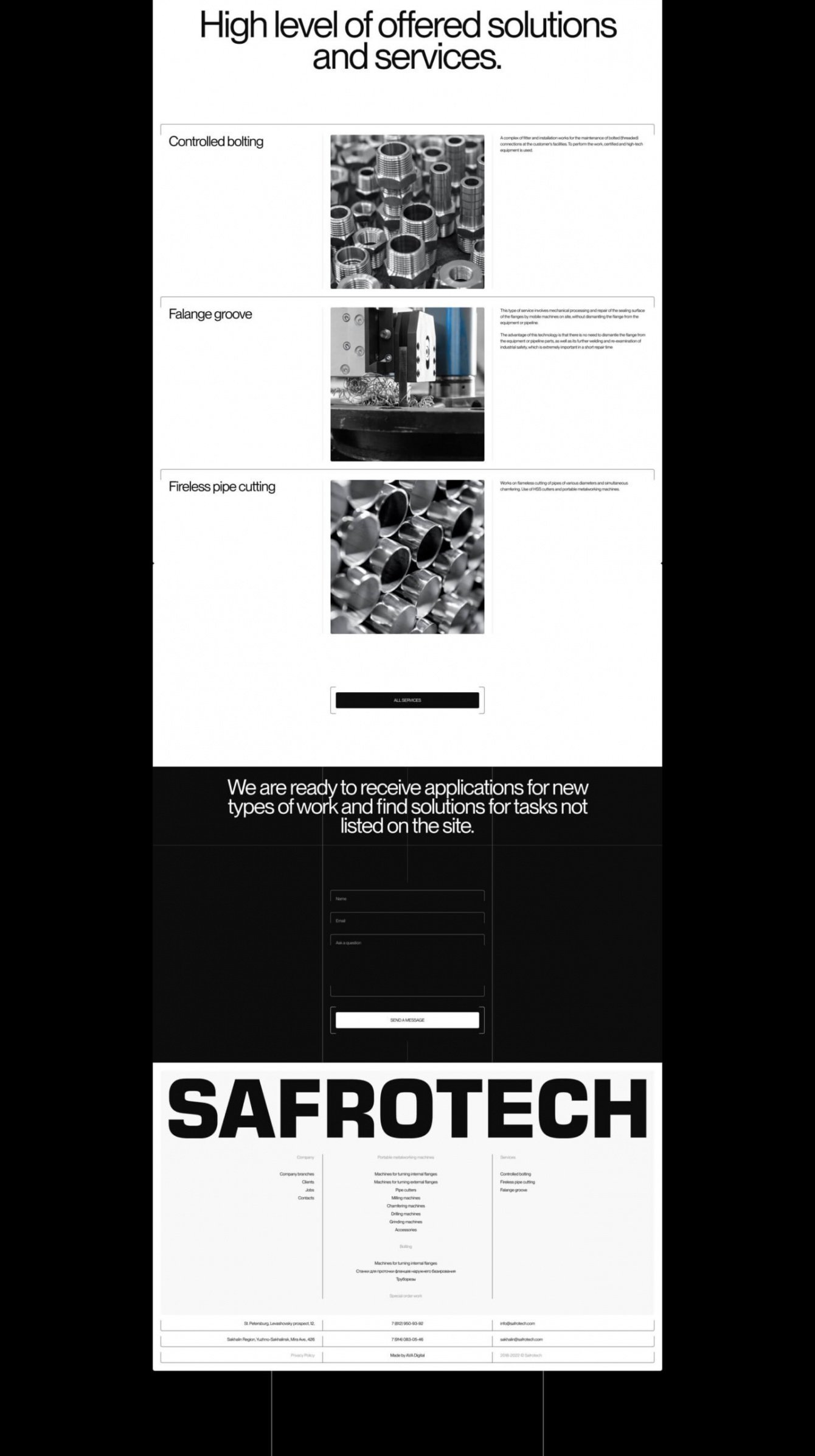 Последней версией сайта перед нашим обновлением была версия на Тильде, которая не отражала всего спектра и объема работы, которые выполняет SAFROTECH. Поэтому мы доработали контент, структуру и фирменный стиль. На сайте появилось несколько новых разделов с подробной информацией, а логотип и фирменные цвета компании теперь смотрятся более современно за счет изменения внешнего вида сайта.
