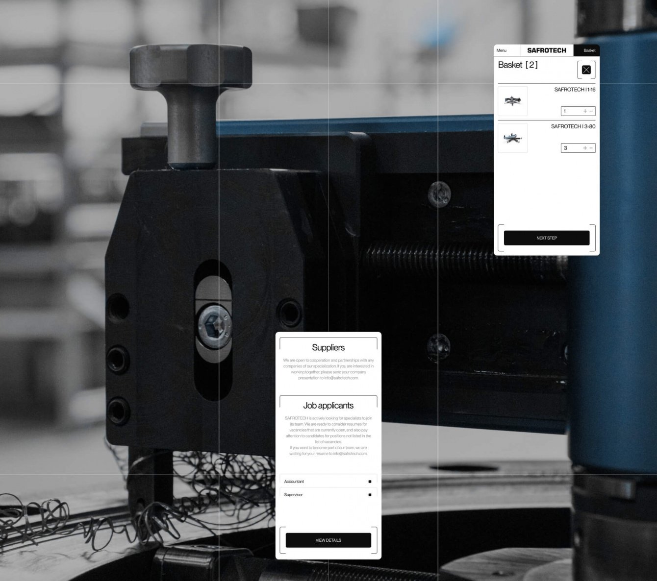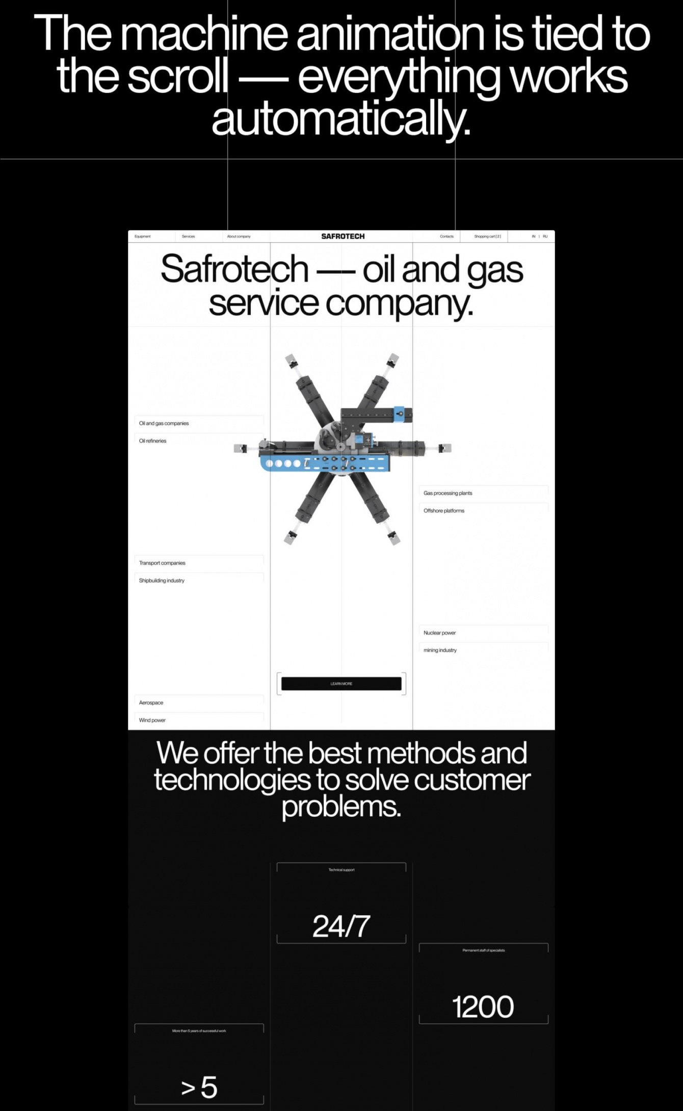 Мы запросили у американских партнеров SAFROTECH инженерную 3D-модель, которую преобразовали и использовали на главной странице сайта. Ее можно рассмотреть со всех ракурсов просто пролистывая страницу — все работает автоматически.