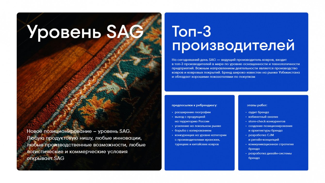 Изучив категорию, рынок, конкурентов и сам бизнес, мы сформировали концепцию позиционирования — уровень SAG. В категории ковров любой уровень, который открывается индустрии, — это SAG. Любую продуктовую нишу, любые инновации, любые производственные возможности, любые логистические и коммерческие условия открывает SAG.