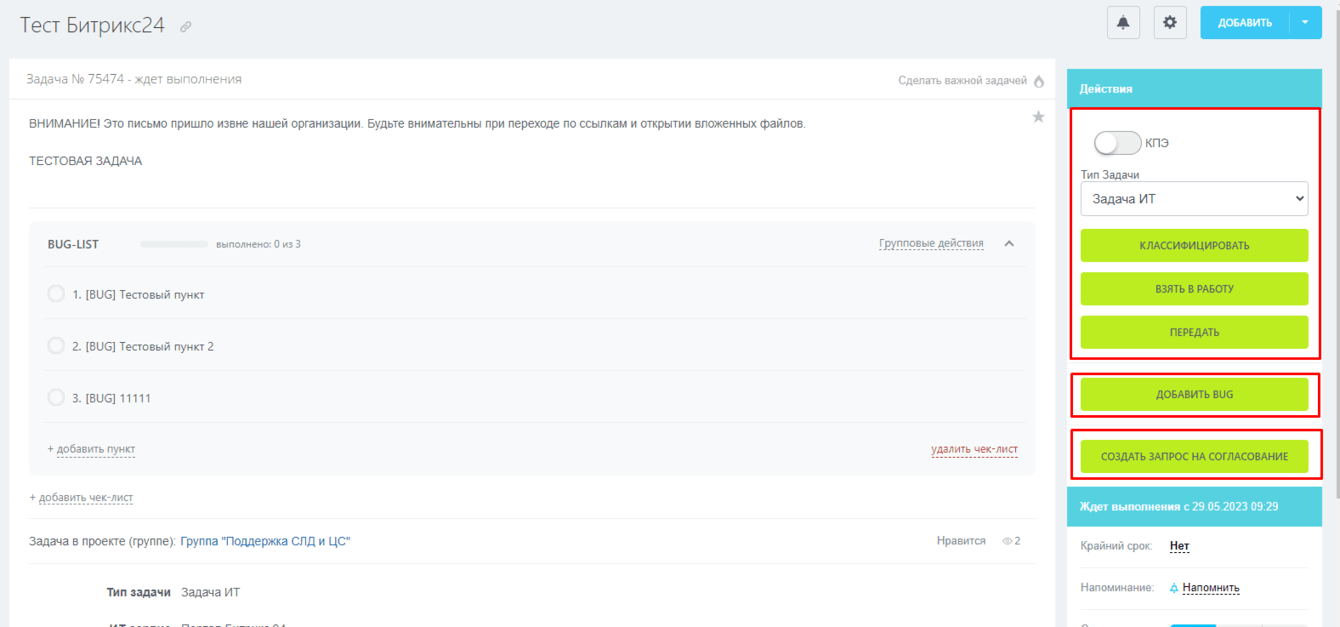 Как видно, в рамках работы с задачей появилось три дополнительных группы действий: