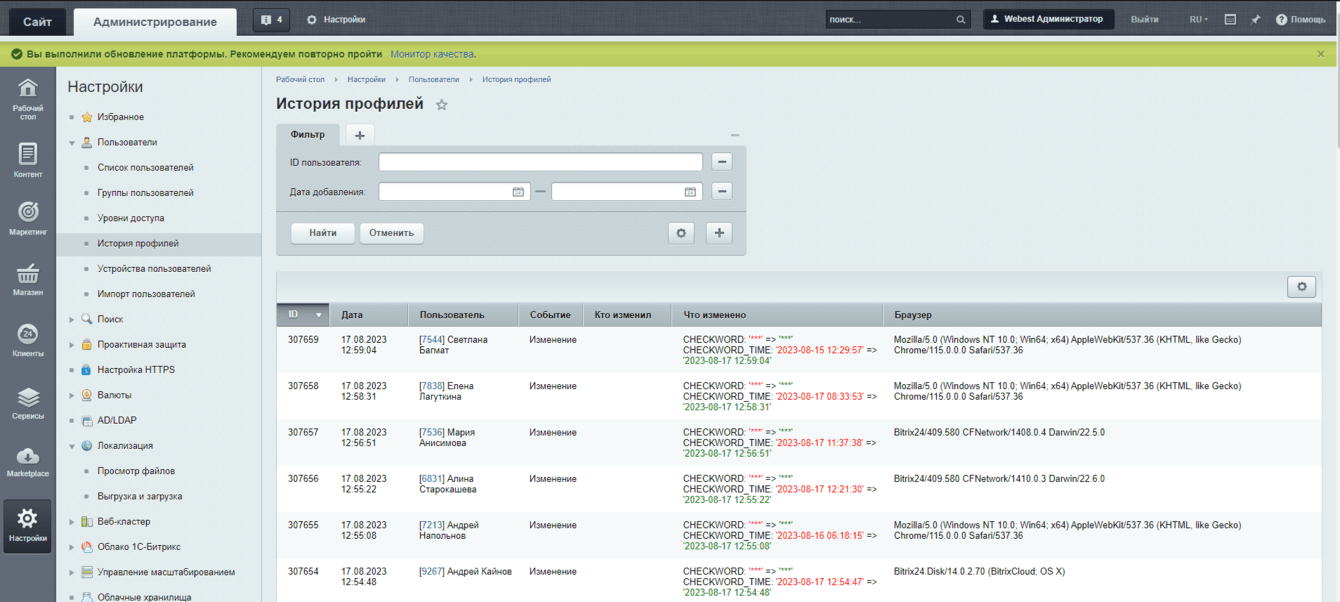 В результате после проведения соответствующих настроек в административной панели портала у сотрудников появились следующие возможности: