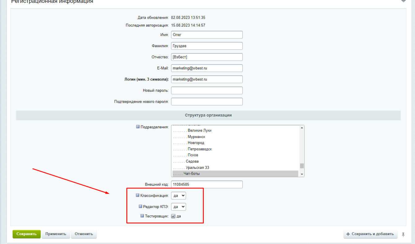 Соответственно, если все признаки активны, то сотрудник может управлять/работать со всем функционалом, а если нет, то только с выбранным (остальной функционал будет скрыт для работы из публичной части).