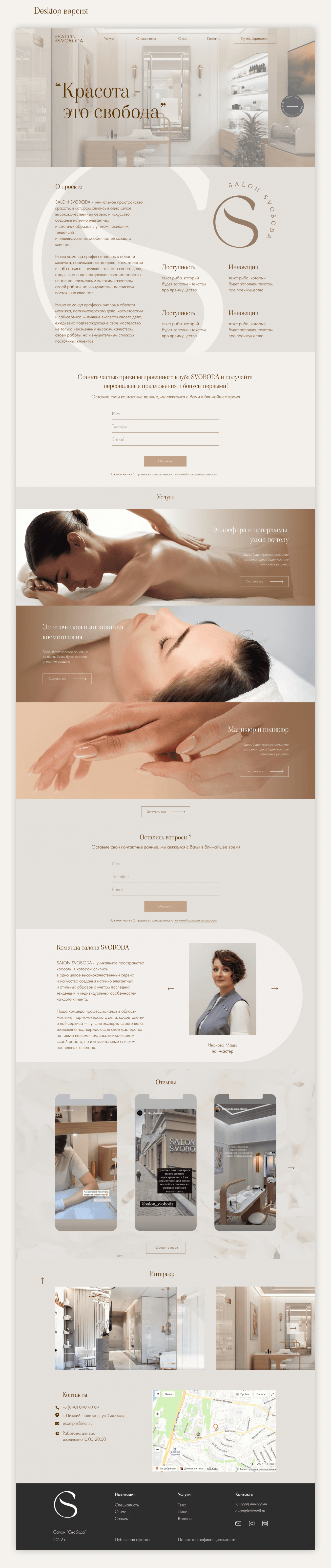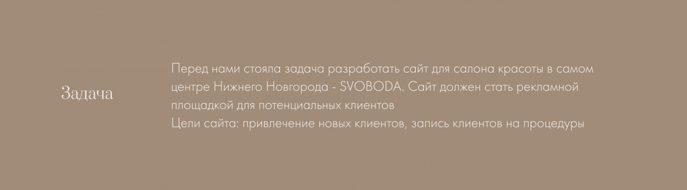 Разработать сайт для салона красоты премиум сегмента в центре Нижнего Новгорода. SVOBODA — новый проект в Нижнем Новгороде, который транслирует идею «Красота в простоте». Эффективные косметологические процедуры и ритуалы красоты в соединении с высочайшим сервисом — все это SVOBODA.