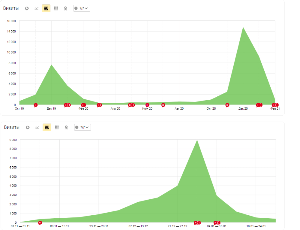 Трафик из поиска на коммерческие страницы за декабрь составил 14 828 визитов. Пик случился в канун Нового года и пару дней после. Мы увеличили трафик по сравнению с прошлым сезоном в 2 раза.