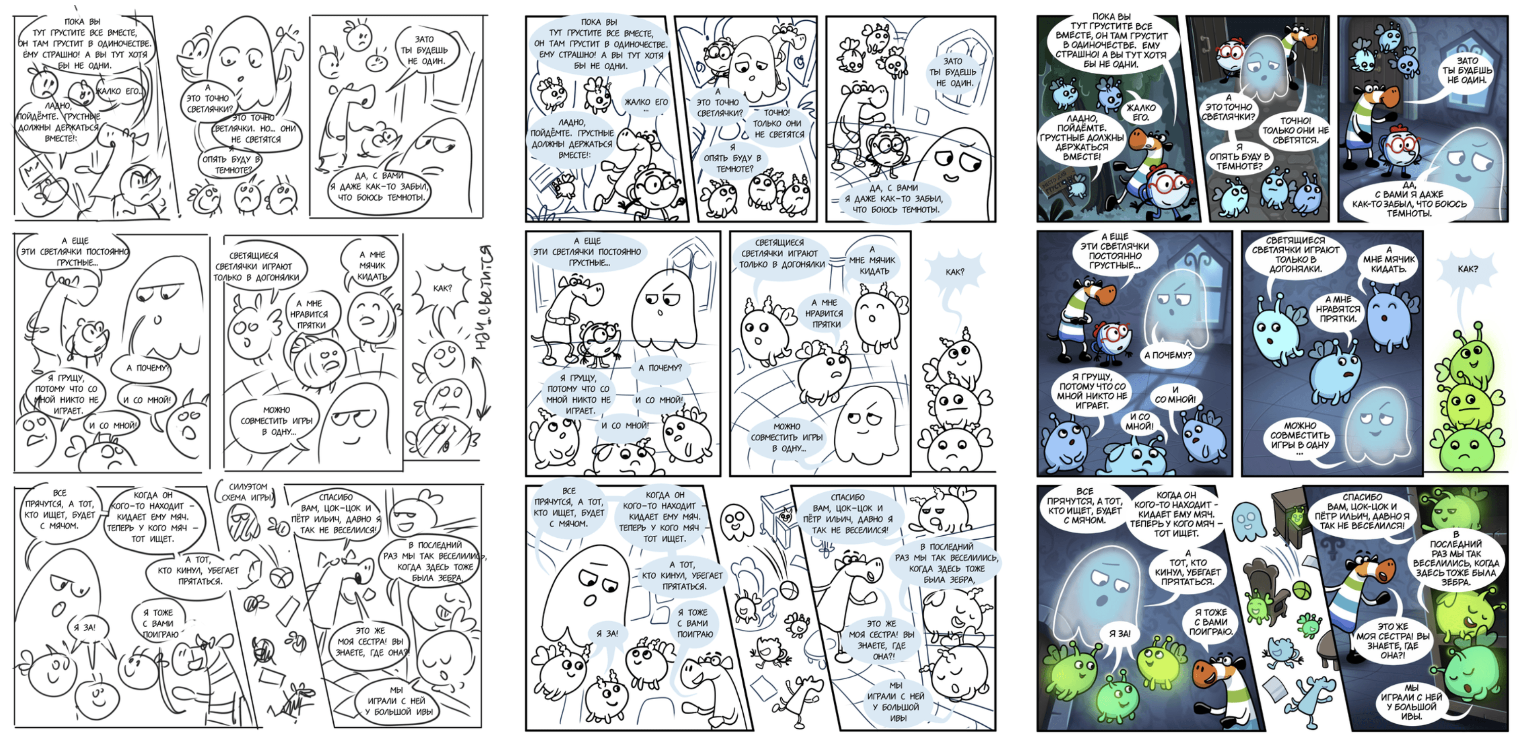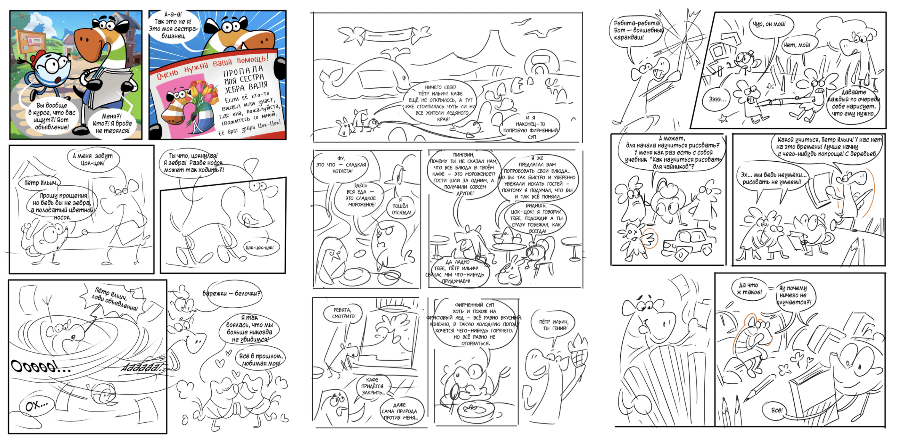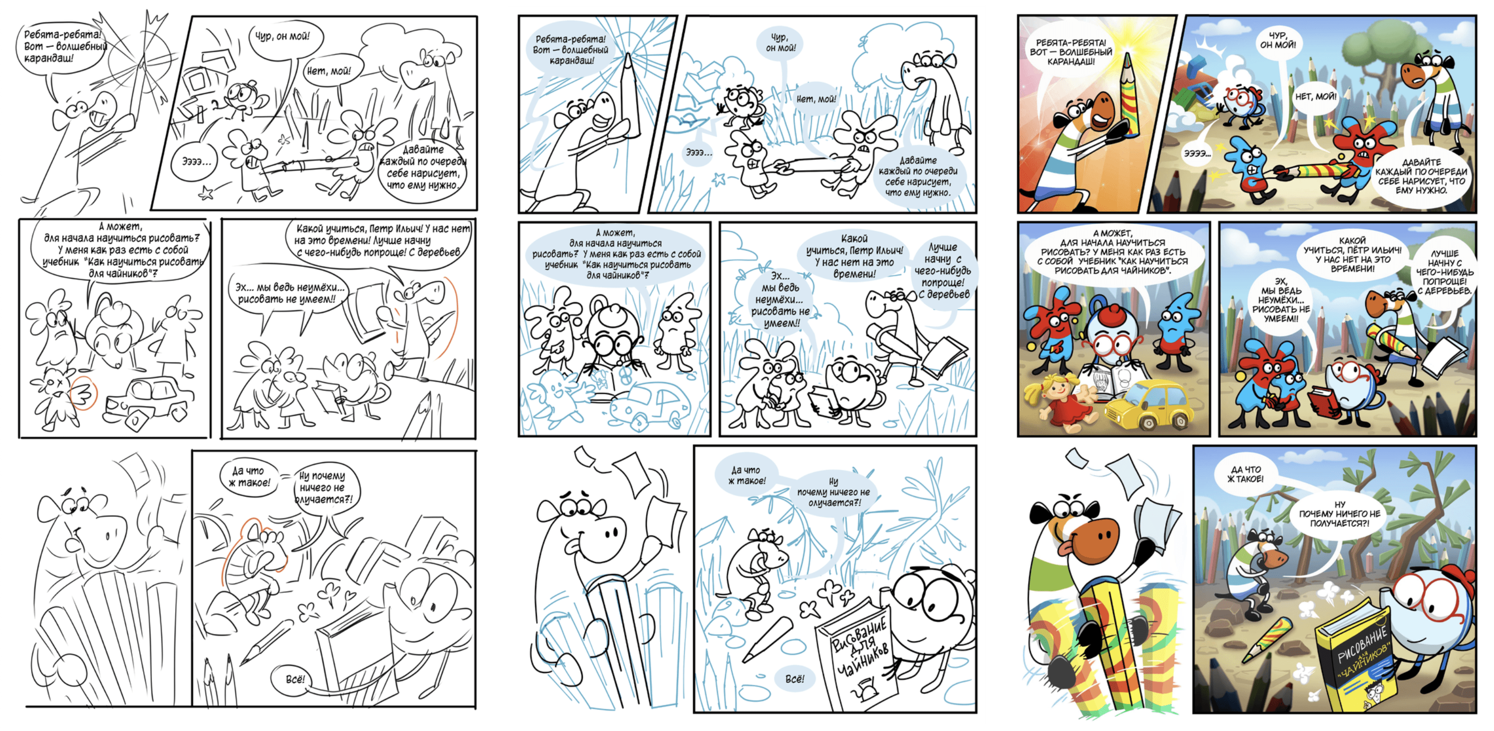 В результате каждая страница получилась живой и увлекательной. На примерах видно, как история прошла путь от простого скетча до полноценной цветной полосы.