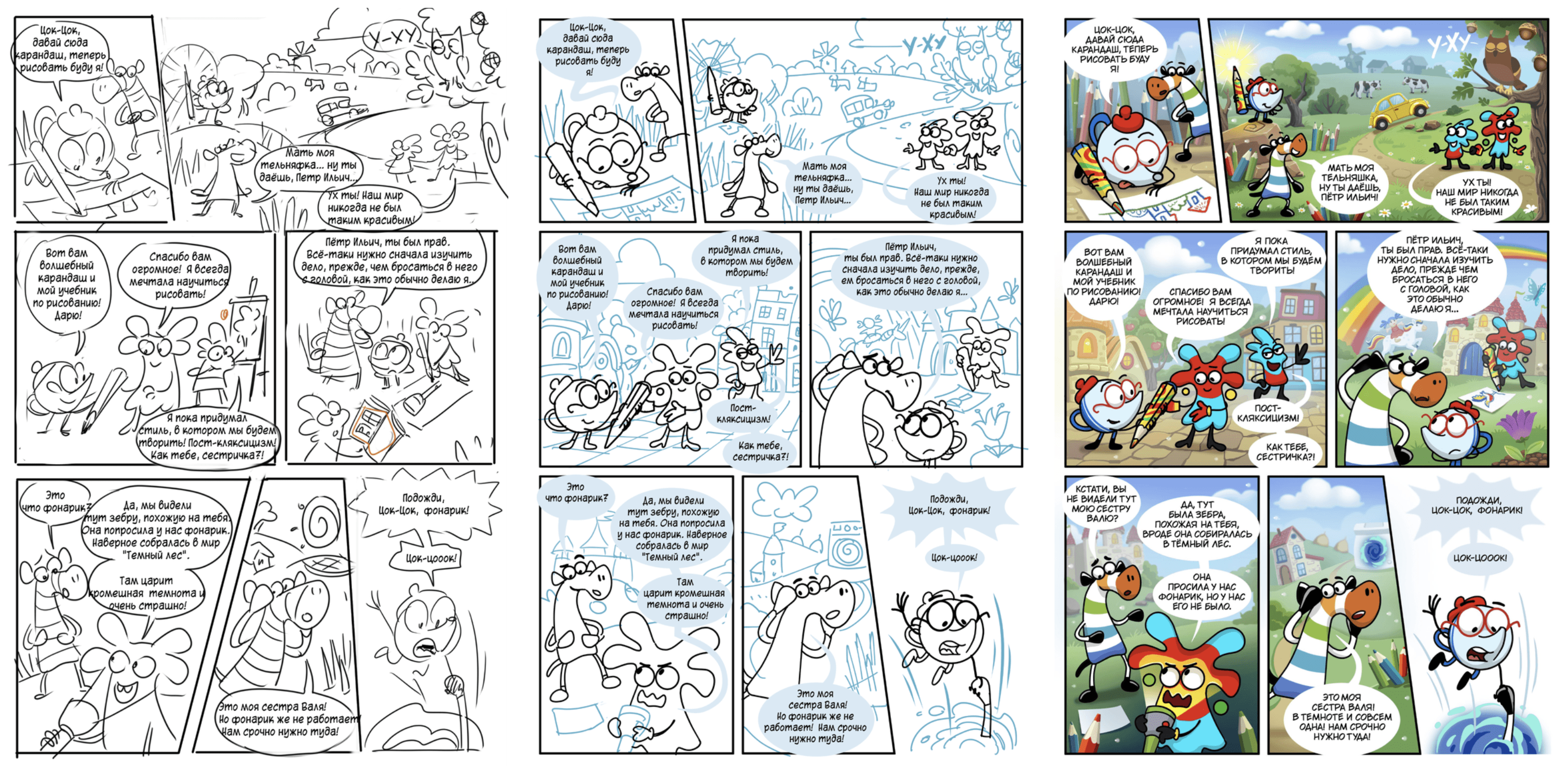 Когда подготовка была завершена, мы перешли к самой яркой части — финализации комикса. Работа шла в два шага: сначала контуры, затем цвет.