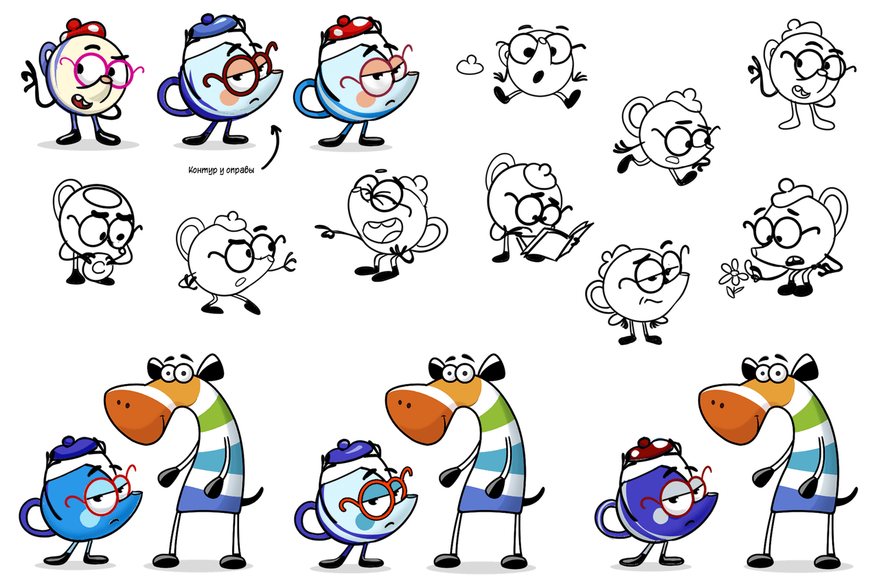 Параллельно с раскадровкой мы начали работать над героями. Самым сложным оказался новый персонаж — чайник Пётр Ильич. Он друг главного героя и важный участник сюжета: помогает решать задачи и преодолевать трудности. Нужно было совместить ум и серьёзность с дружелюбием и обаянием, чтобы персонаж был близким и понятным детям.