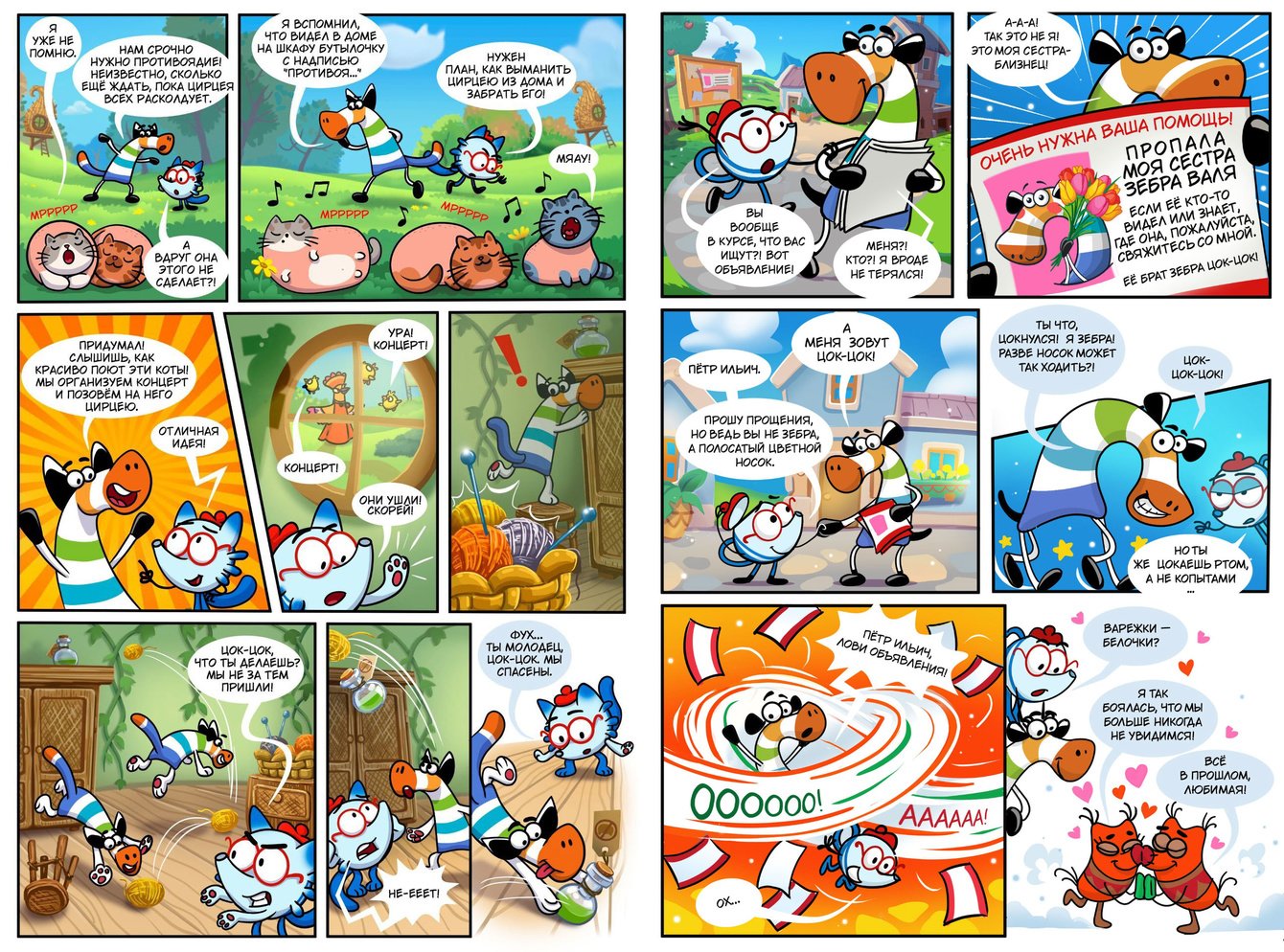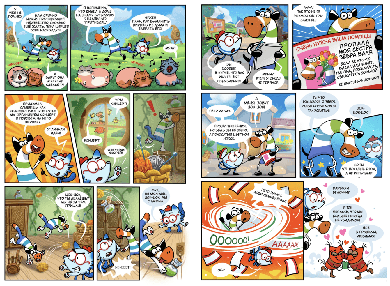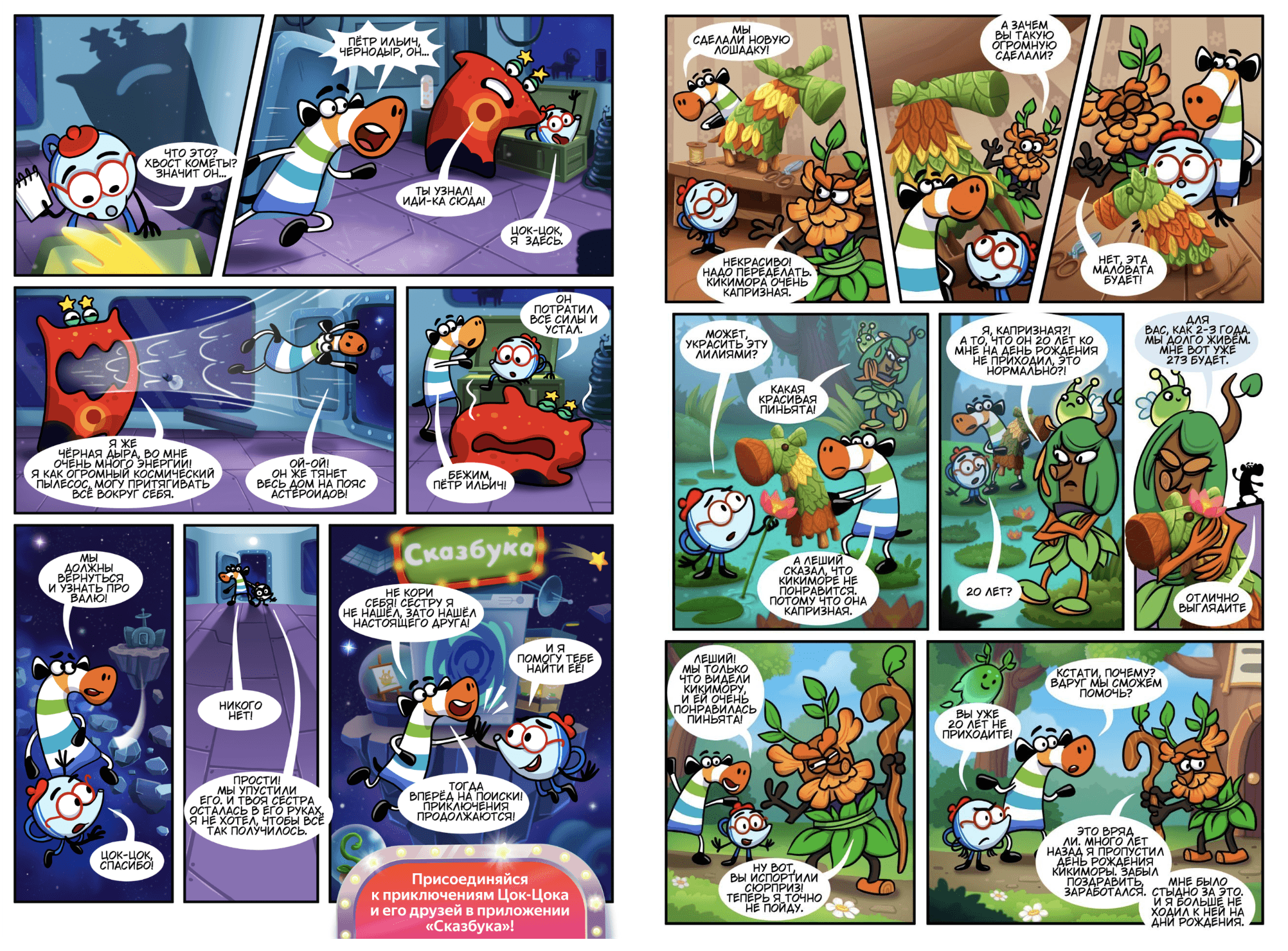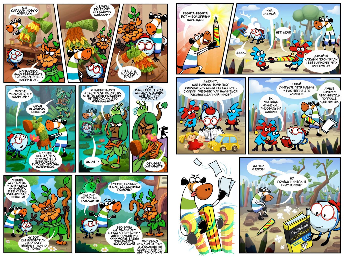 Мы адаптировали сказку в сценарий комикса, сделали раскадровку и разработали визуальный стиль. Создали 36 полос комикса, яркую обложку, логотип и нового персонажа — чайника Петра Ильича. Иллюстрации и дизайн оформили так, чтобы они сразу привлекали детей и передавали настроение всей истории.