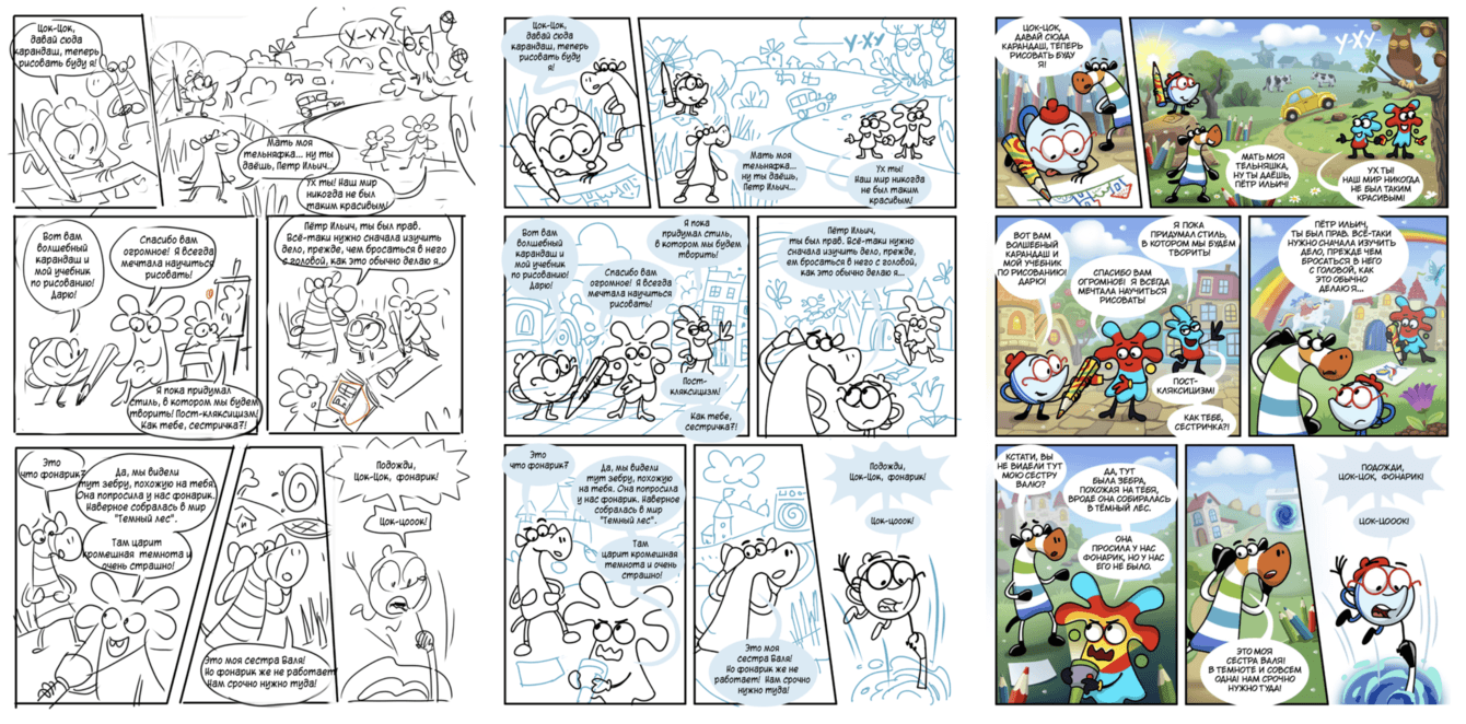Мы адаптировали их под новый стиль: доработали детали, упростили формы и сделали образы более удобными для восприятия детьми. Все персонажи прошли отдельное согласование с клиентом ещё до начала основной работы над страницами. Это позволило сохранить целостность вселенной и сделать историю интересной как детям, так и родителям.