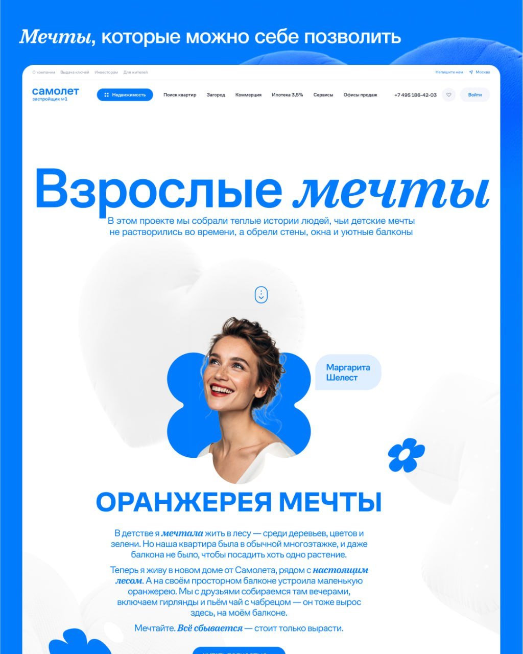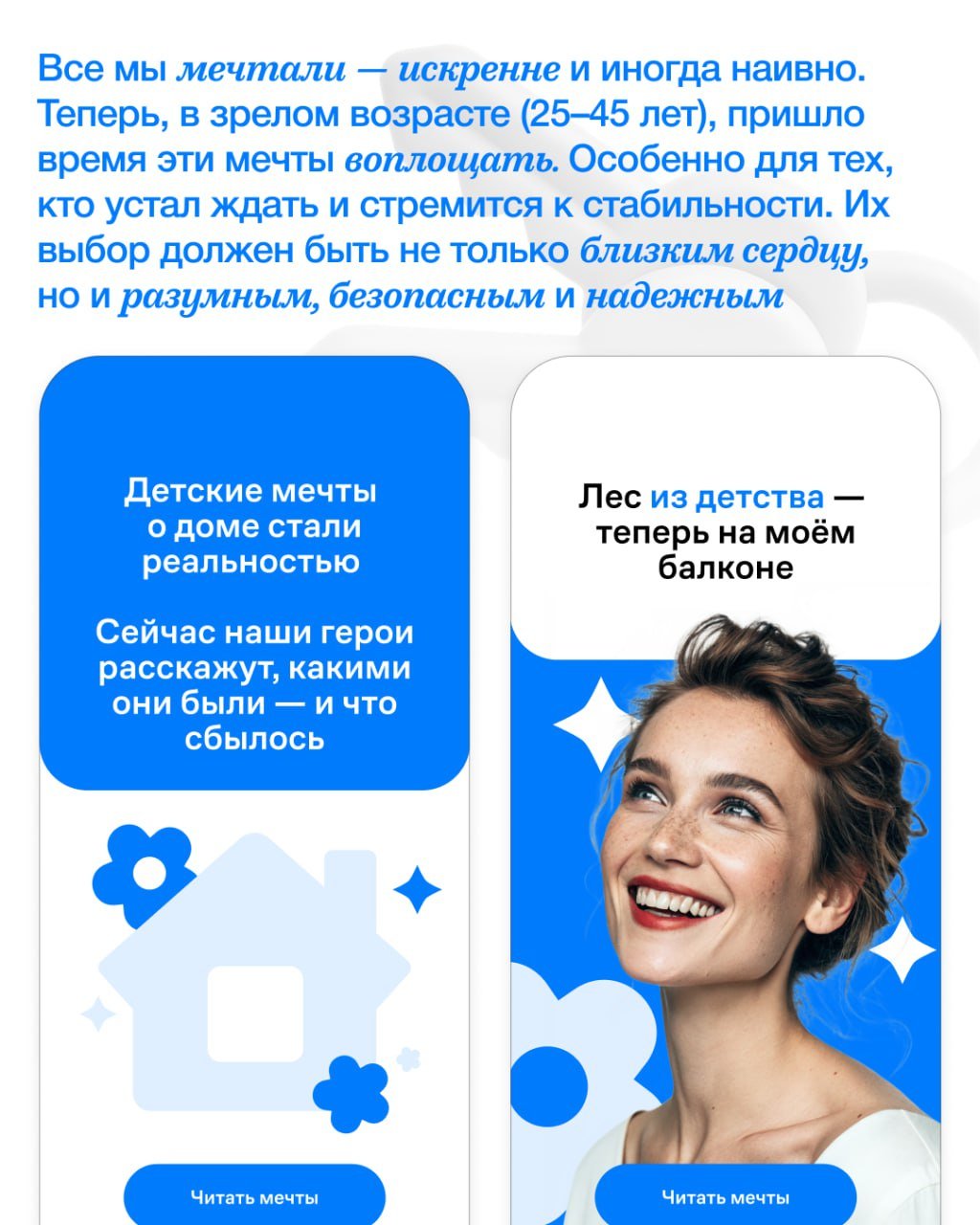 Параллельно мы предложили запустить конкурс, где людям предлагается вспомнить, о каком доме они фантазировали в детстве, и рассказать об этом. Лучшие истории должны были стать частью самой кампании. Визуально работали через противопоставления: «ребёнок–взрослый», «мечта–квартира».