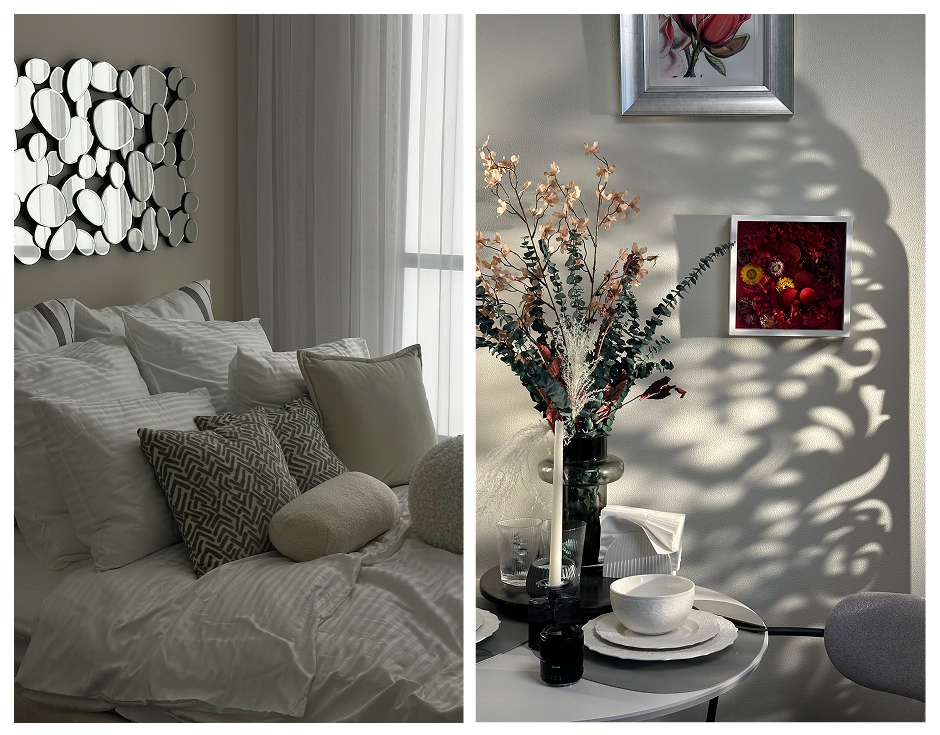 Следующая задача касалась шоурума Manzara Towers. Самолет создал полностью меблированные, продуманные квартиры. Все настолько естественно, что даже посуда, столовые приборы, чайники, салфетки, свечи, полотенца и весь бытовой стафф — настоящий. Знаем не понаслышке — ибо один бокал по неаккуратности разбили на съемке. Ну а что поделать — реальный быт он такой.