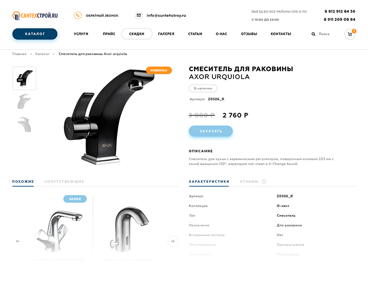 Начали с главного, а именно – с карточки товара. Удобно организовали информацию о товаре и расставили акценты на преимуществах, а также решили выявленную на этапе аналитики потребность по подбору подходящих товаров под требования пользователя.