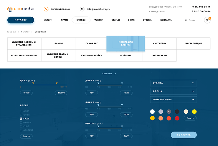 Фильтрам мы уделили особое внимание. Прежде всего, на этапе проектирования мы совместно с клиентом составили подробное разделение по каждому предполагаемому разделу каталога сайта, выделив только самое необходимое. По реализации мы исходили из соображений, что фильтры должны быть простые, удобные и не должны мешать просмотру каталога.
