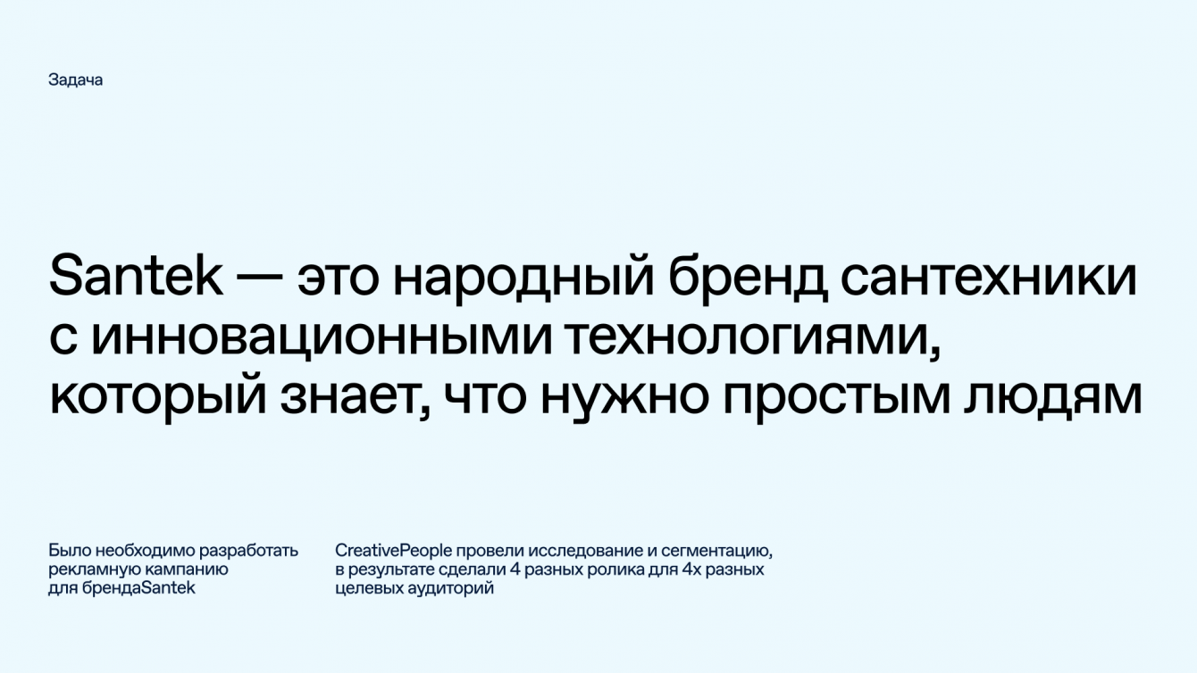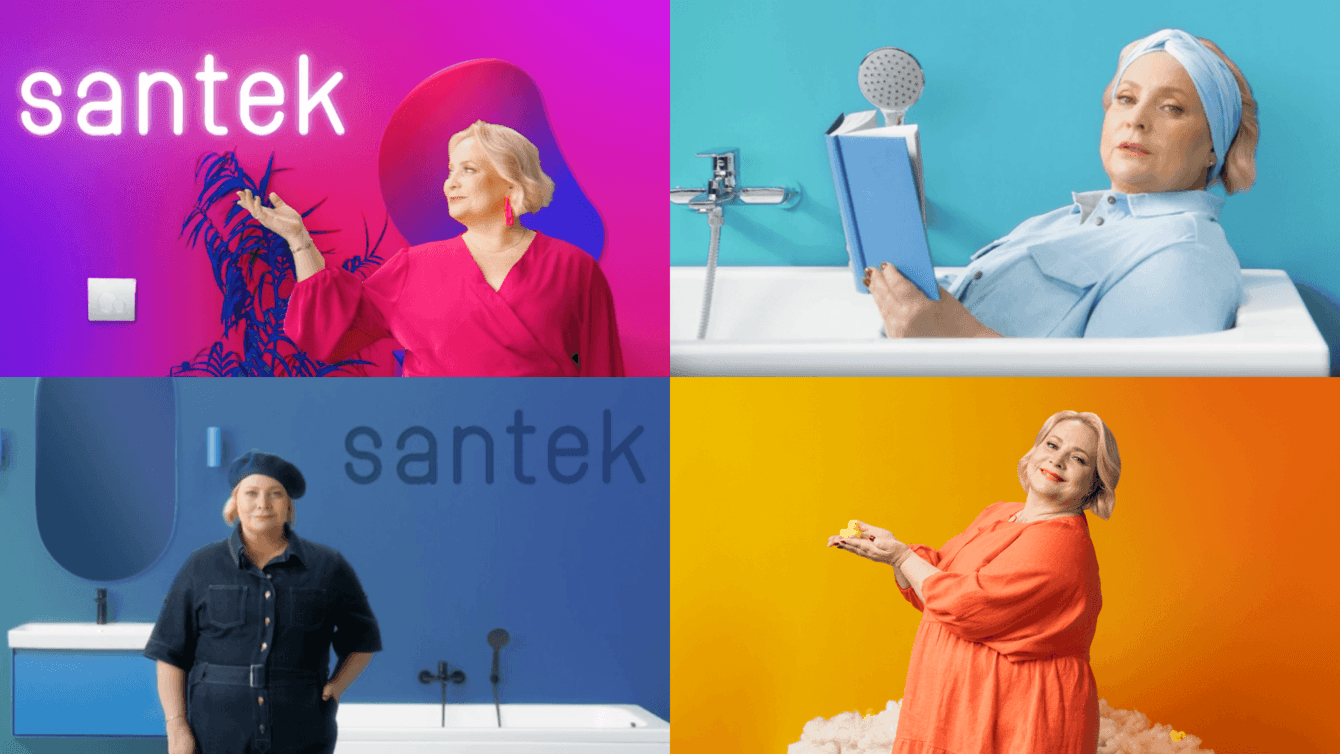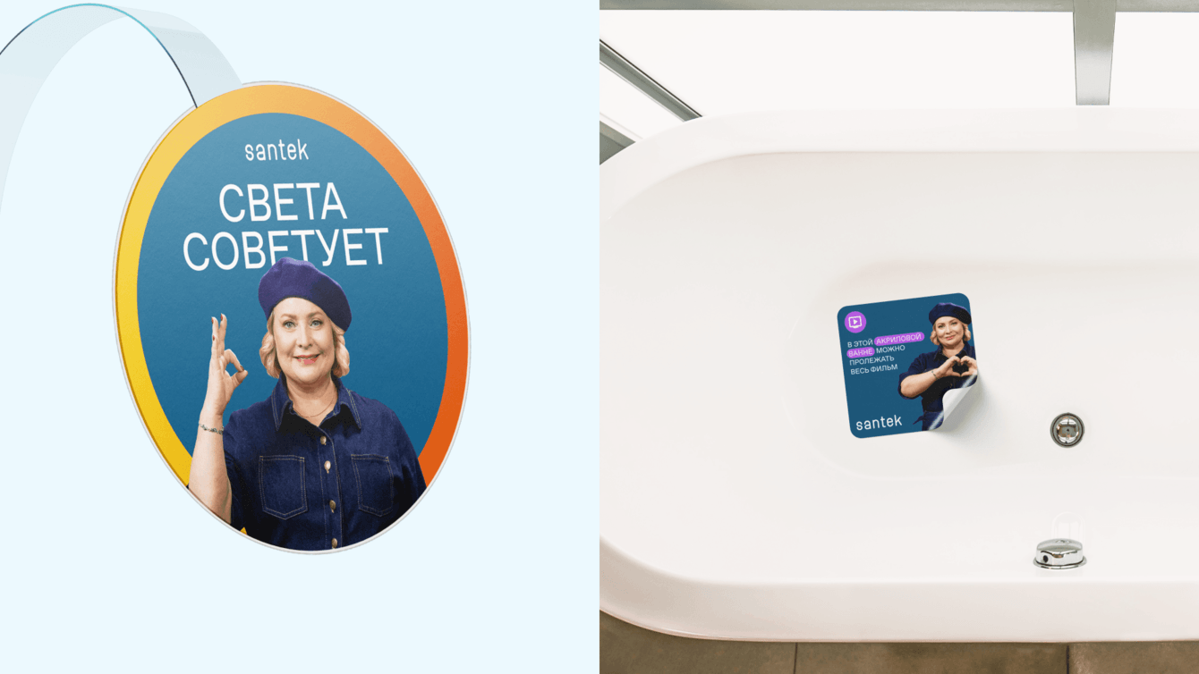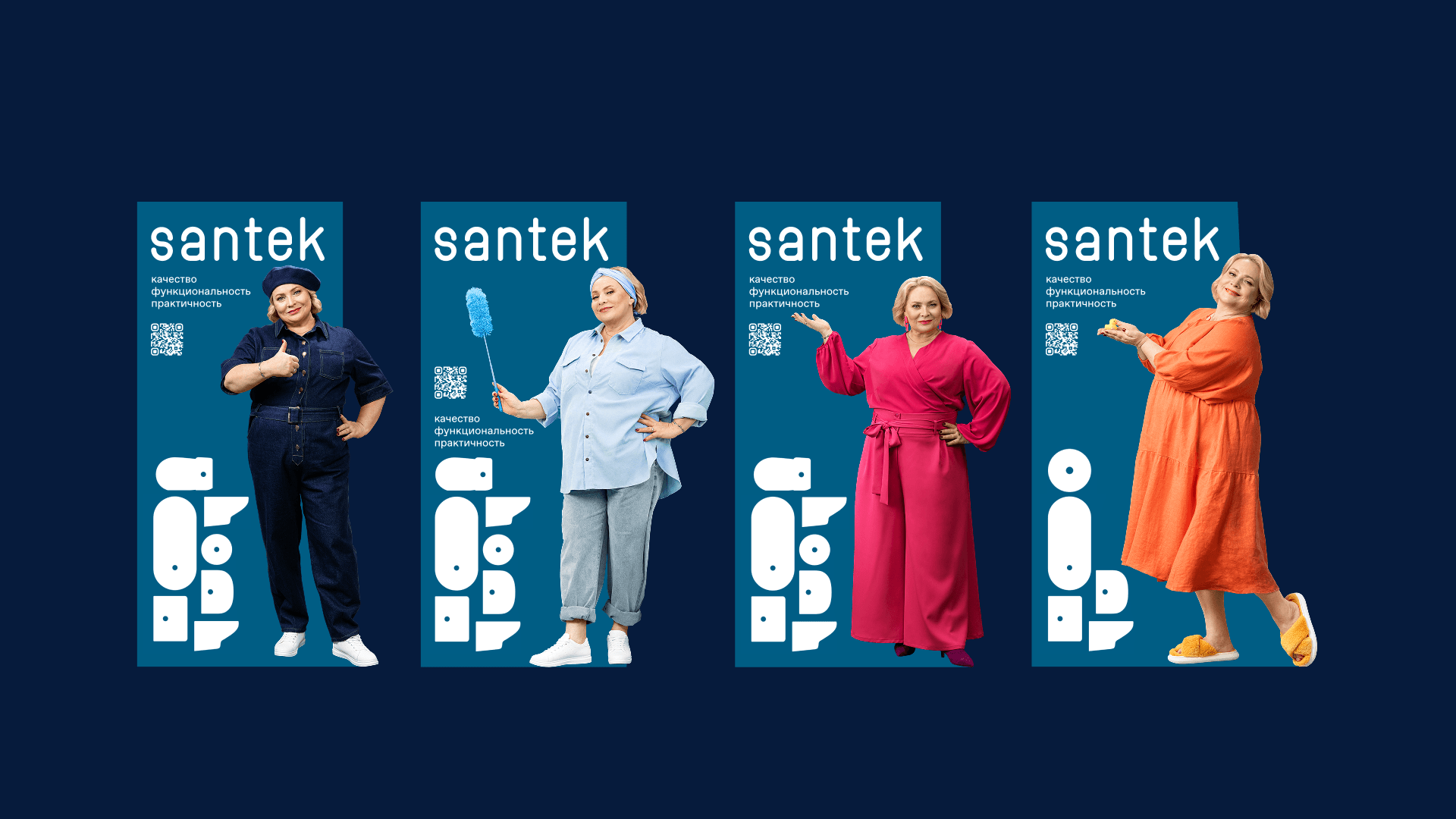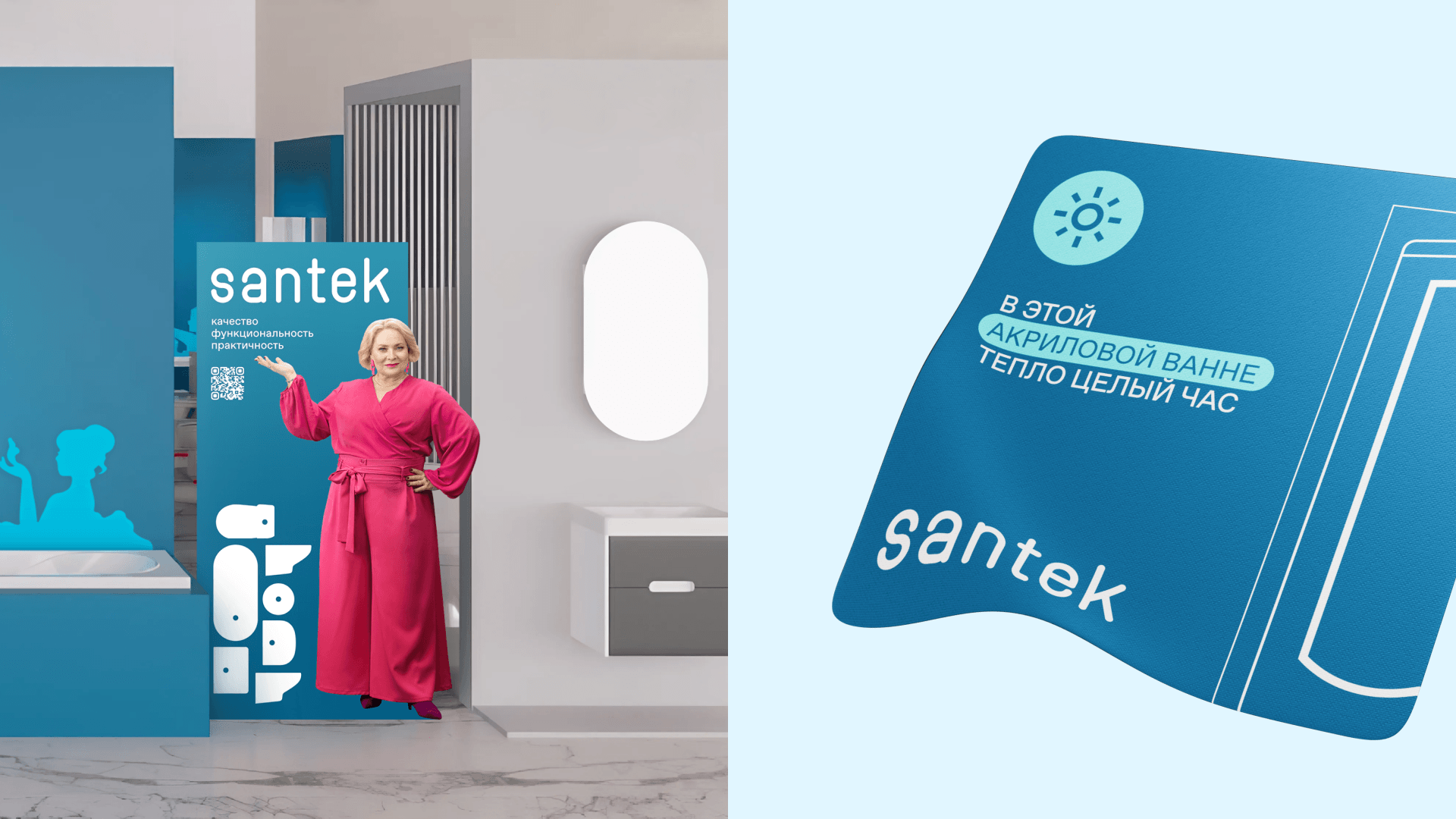 Наша задача состояла в том, чтобы помочь бренду Santek разработать и запустить рекламную кампанию с новым амбассадором — Светланой Пермяковой, актрисой, которую знают и любят во всей России. Кампания направлена на укрепление позиций бренда сантехники на рынке и привлечение новых сегментов аудитории, а также на повышение узнаваемости марки в регионах. Мы создали для неё креативную концепцию, охватывающую не только разработку идеи, но и полную стратегию коммуникации, включая key visual и сценарии для видеороликов.