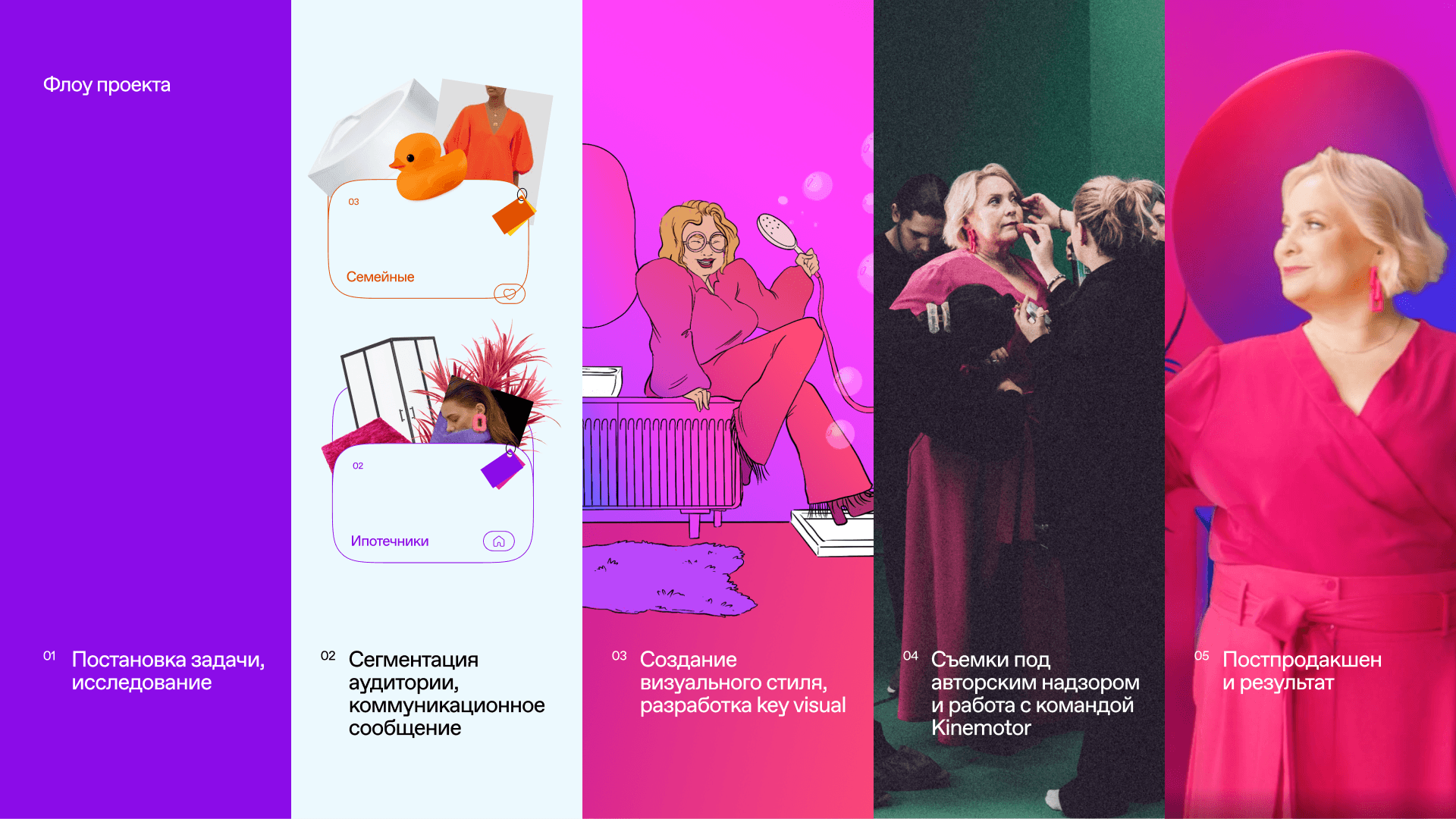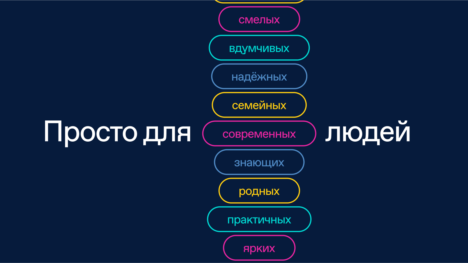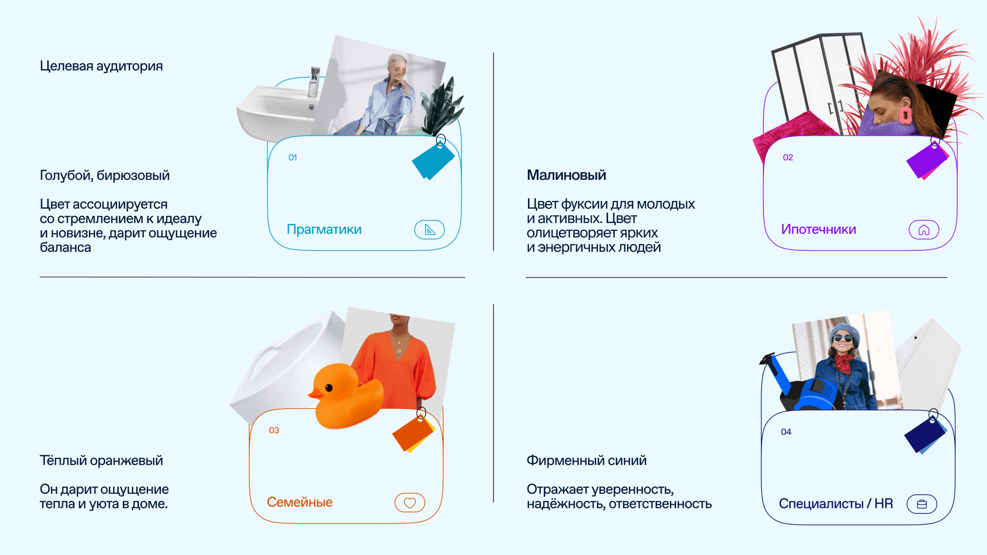 Для каждого сегмента аудитории был выбран свой цвет: смелая фуксия для молодёжи, тёплый оранжевый для семей, фирменный синий для экспертов и бирюзовый для прагматиков. Это решение помогло нам создать визуальный контраст, сохранив при этом целостность бренда.