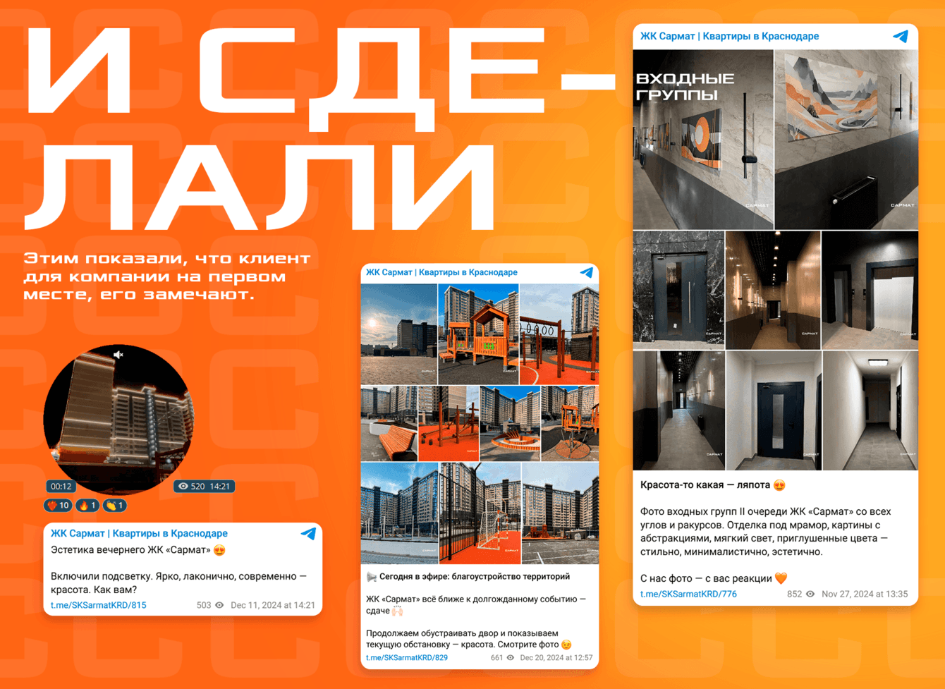 Только на общении мы не остановились: по запросам потенциальных клиентов и дольщиков из комментариев делали контент. Как идет благоустройство территорий? Покажем. Как будут выглядеть подъезды? Пост уже в ленте. Публиковать планировки со скидками, а не ценой за квадратный метр? Будет сделано. Так мы показали, что клиент для компании на первом месте, его замечают.