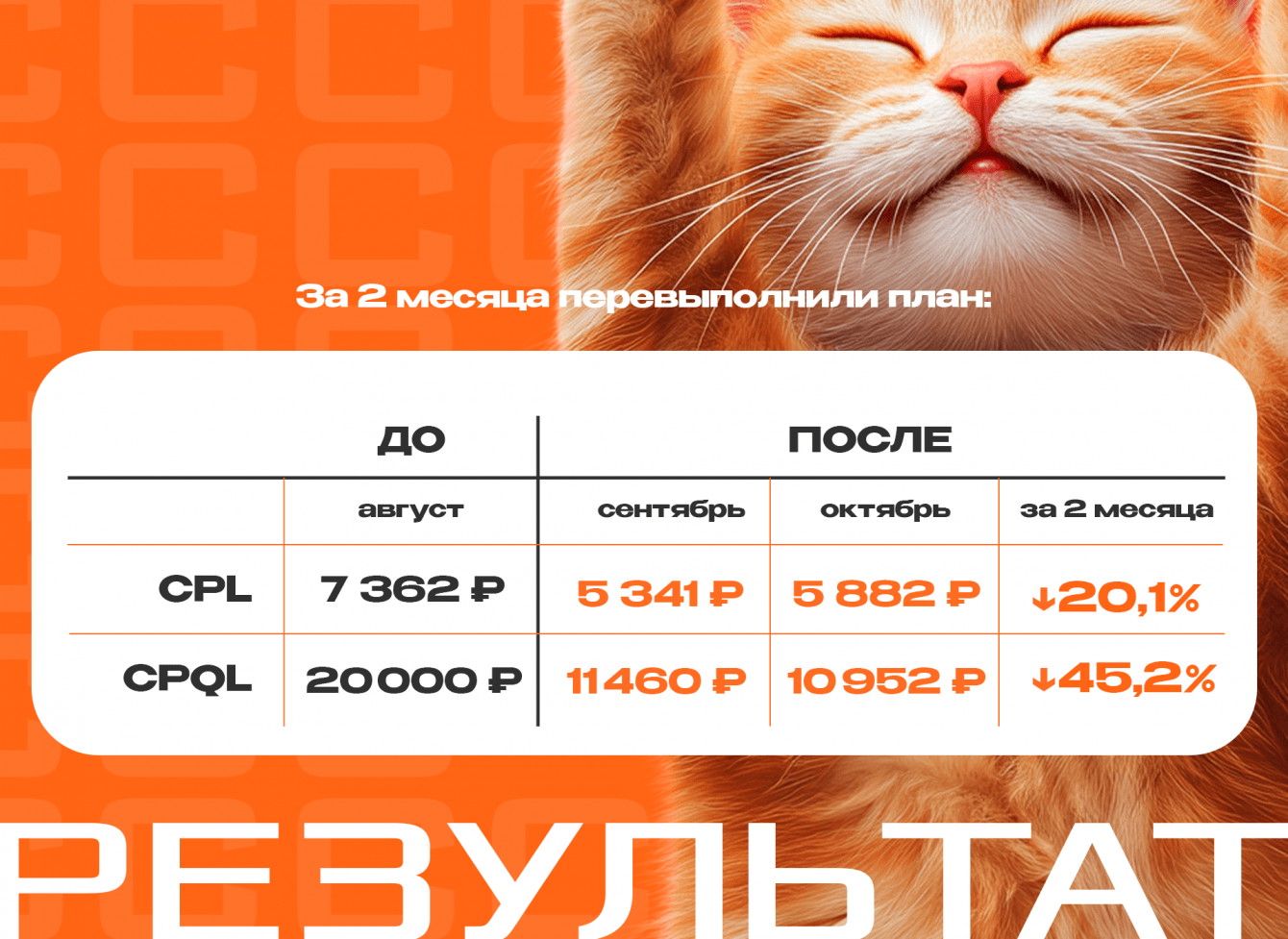 Кампания с 1 сентября по 31 октября завершилась успешно: стоимость качественного лида снижена на 45% с 20 000 ₽ до 10 952 ₽ при плановых 12 000 ₽.