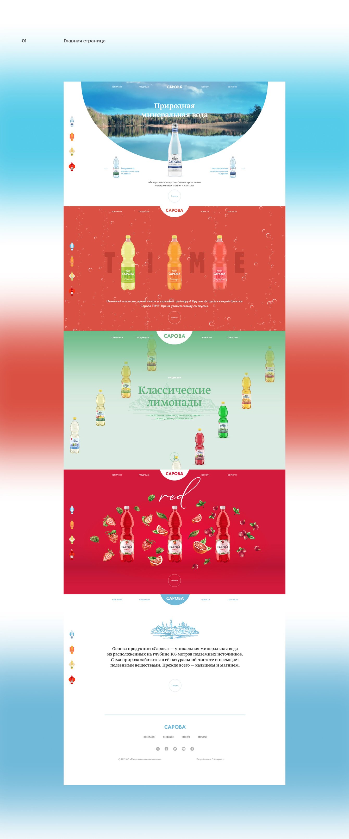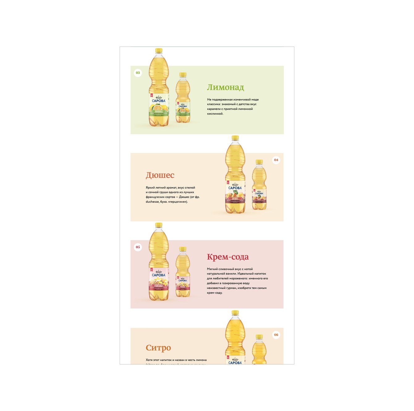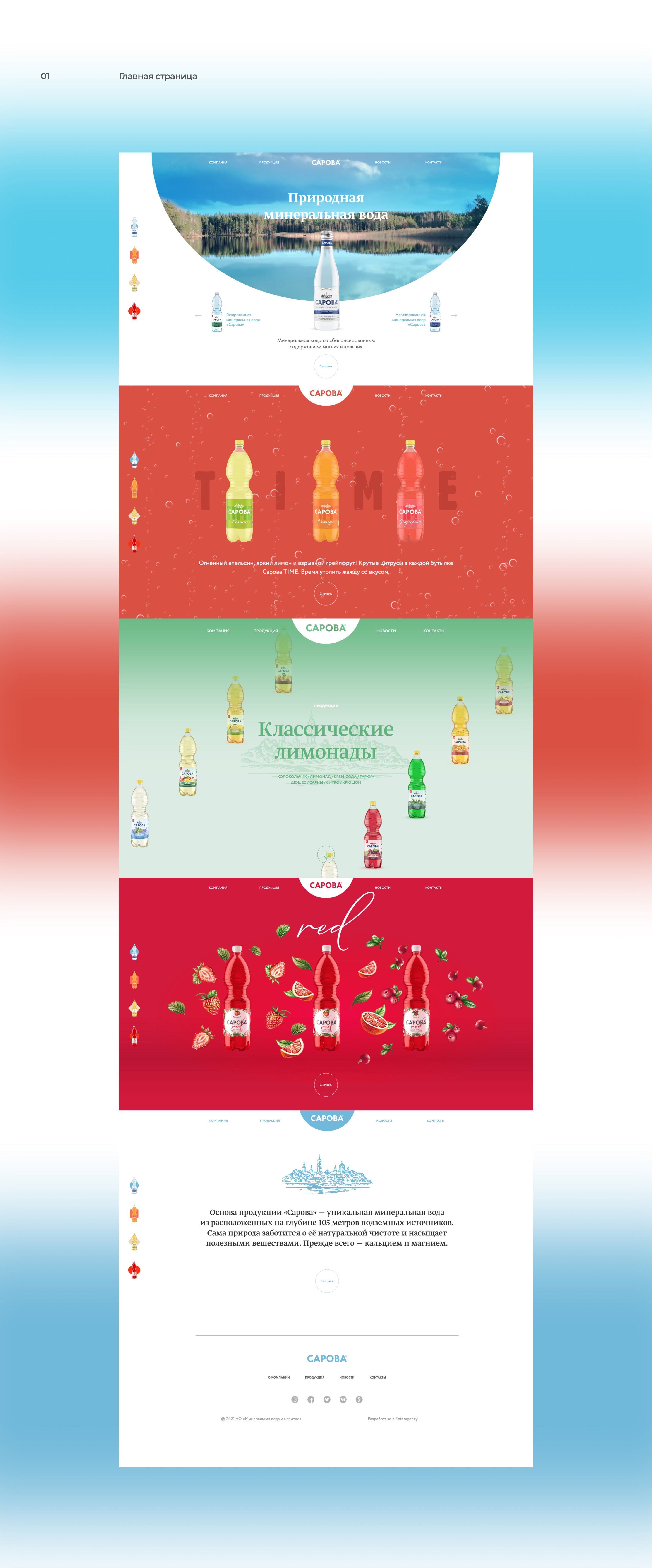 Каждый экран — отдельный мир. Вода «Сарова» вбирает в себя богатства природных источников, которые находятся среди русских лесов и озер, в экологически чистых местах. Серия лимонадов TIME — это прежде всего настроение, дерзкие вкусы и яркие впечатления. Классическая линейка лимонадов (саяны, тархун, крюшон и т. п.) — исконно русские традиции и спокойные оттенки. А новая линейка RED — это польза спелых ягод и фруктов и натуральная минеральная вода.