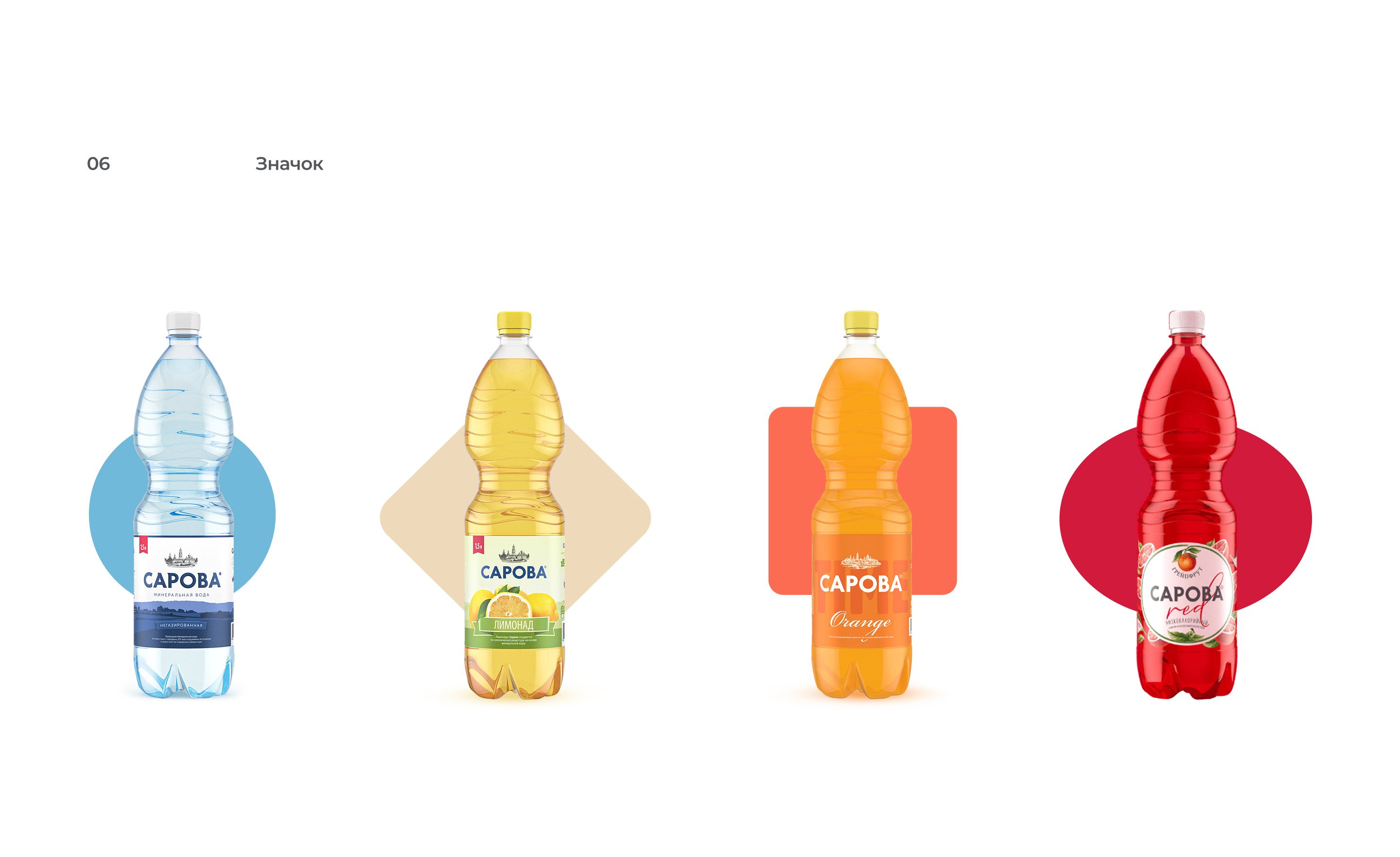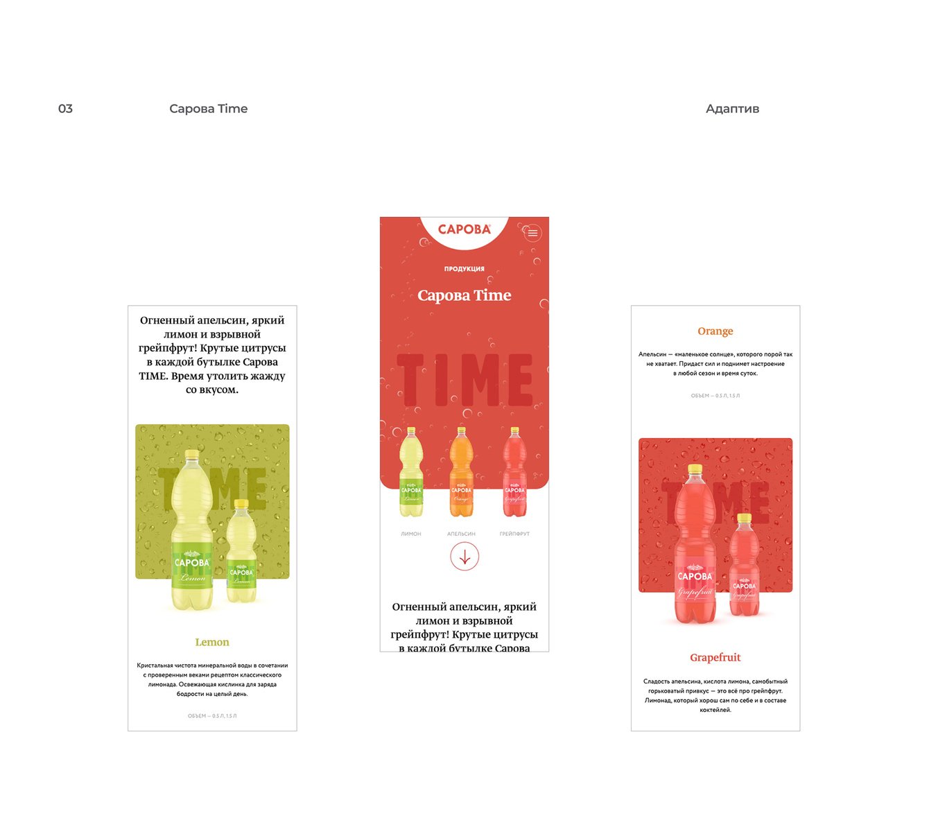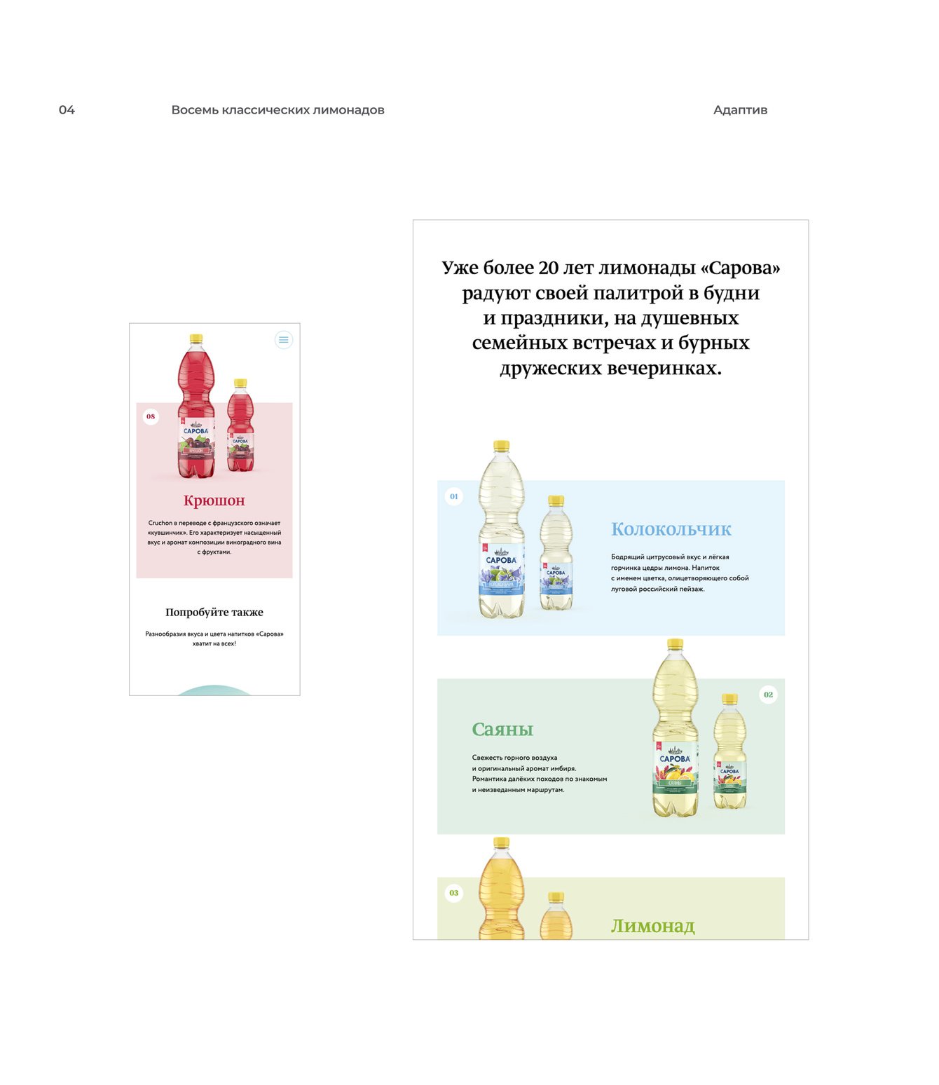 Каждый экран — отдельный мир. Вода «Сарова» вбирает в себя богатства природных источников, которые находятся среди русских лесов и озер, в экологически чистых местах. Серия лимонадов TIME — это прежде всего настроение, дерзкие вкусы и яркие впечатления. Классическая линейка лимонадов (саяны, тархун, крюшон и т. п.) — исконно русские традиции и спокойные оттенки. А новая линейка RED — это польза спелых ягод и фруктов и натуральная минеральная вода.