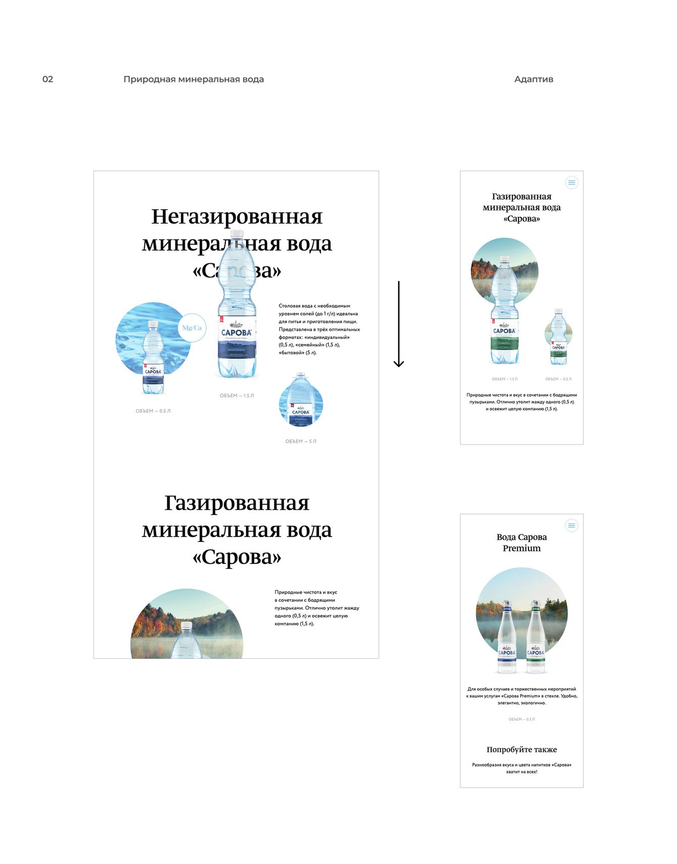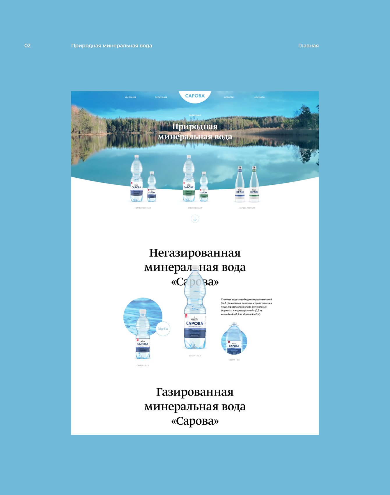 Раздел с минеральной водой рассказывает про заповедные места рождения воды «Сарова», а также про полный спектр воды в стекле и пластике)