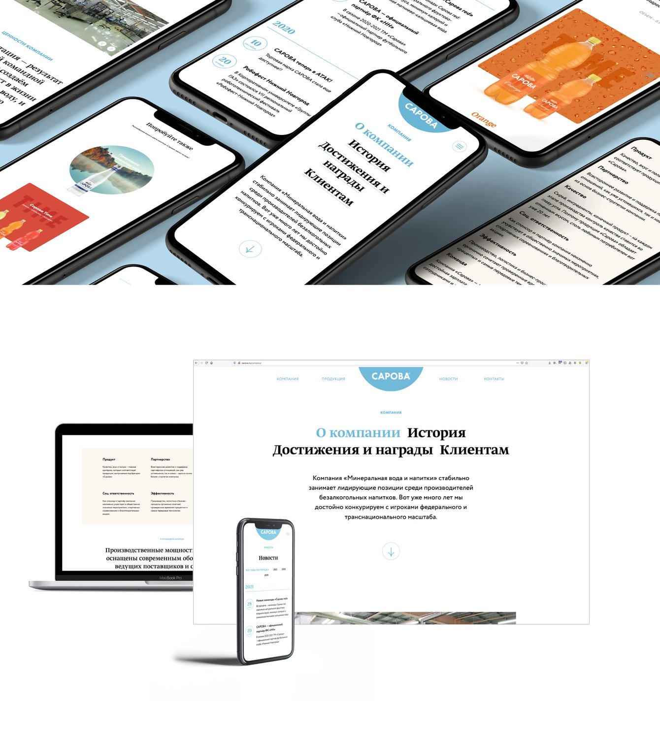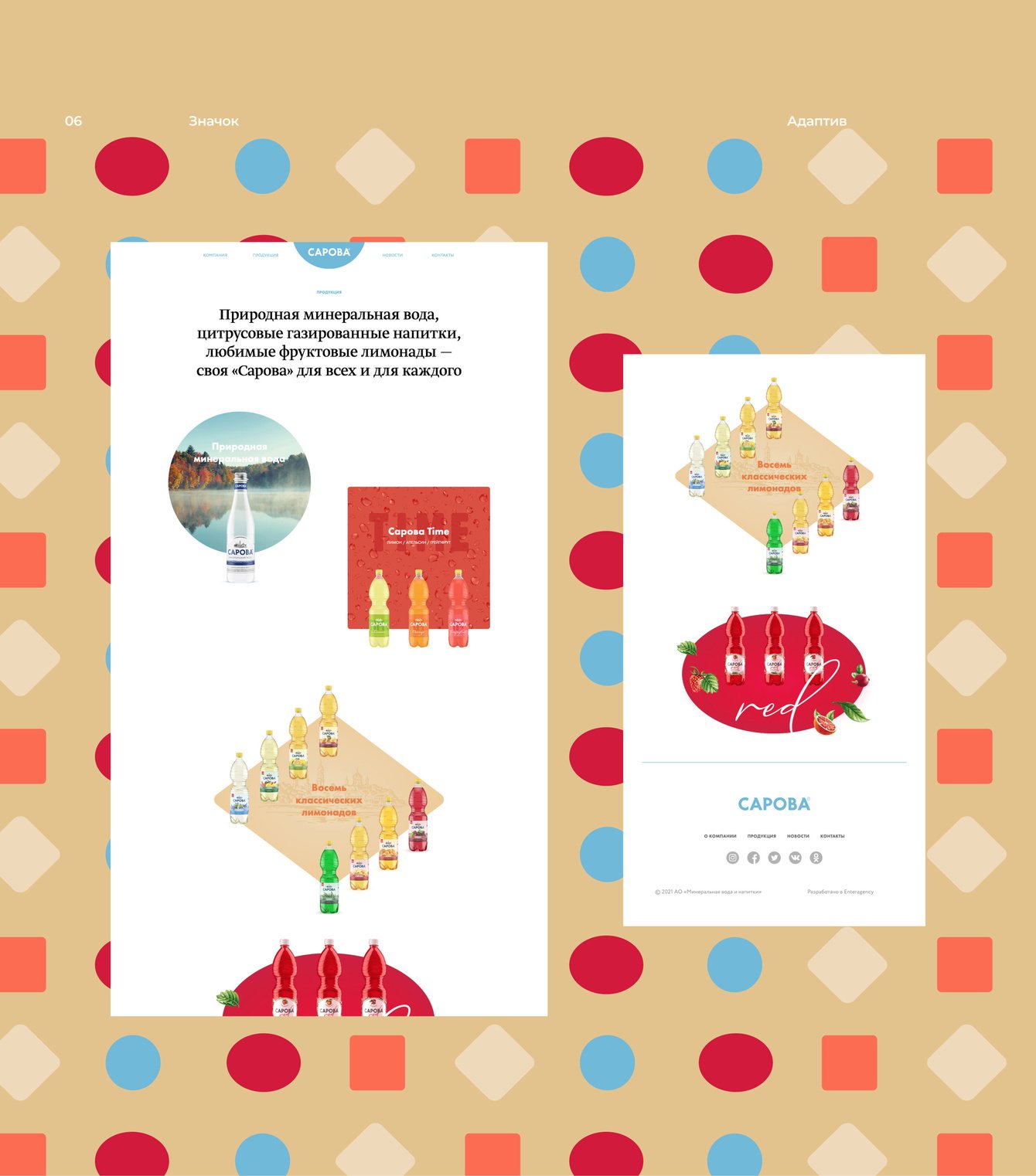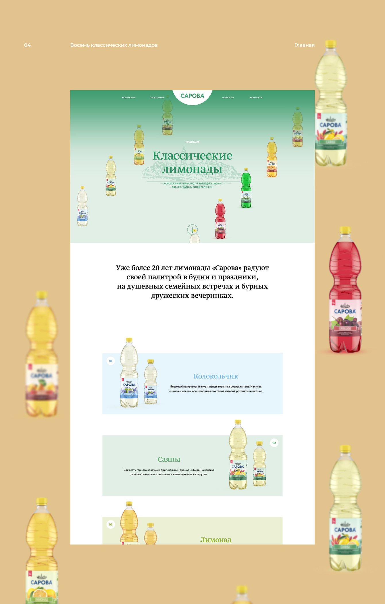 АО «Минеральная вода и напитки» – производитель минеральной воды и классических лимонадов, выпускаемых под брендом «Сарова». Это всегда качественная природная минеральная вода и знакомые с детства вкусы – саяны, лимонад, тархун, крюшон и т.п. Предыдущая версия сайта уже не соответствовала современным тенденциям, нужно было разработать новый, который таким тенденциям соответствует. Более того — нужно было нестандартное решение, позволяющее абстрагироваться от формы бутылок и подарить настроение.