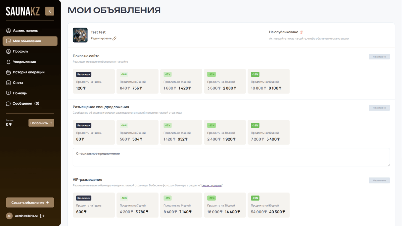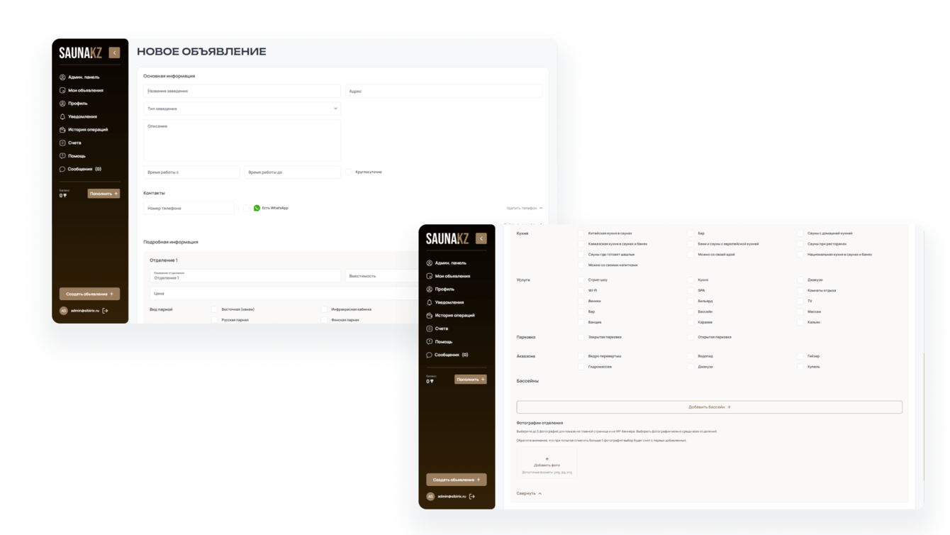 Важно было продумать пути разных пользователей: не только тех, кто ищет место для отдыха, но и тех, кто на этом зарабатывает. Мы отрисовали полноценный личный кабинет для владельцев бань и саун, в котором удобно создавать объявления с нуля, настраивать услуги и подключать продвижение для своих предложений.