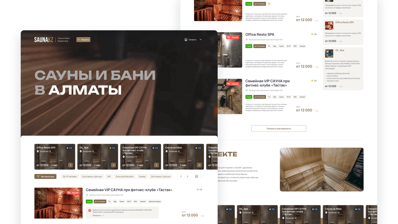 Sauna.kz — агрегатор бань и саун на казахстанском рынке. Он помогает потребителям выбрать среди огромного количества предложений от владельцев банных комплексов, учитывая запросы: от количества отдыхающих до количества бассейнов.
