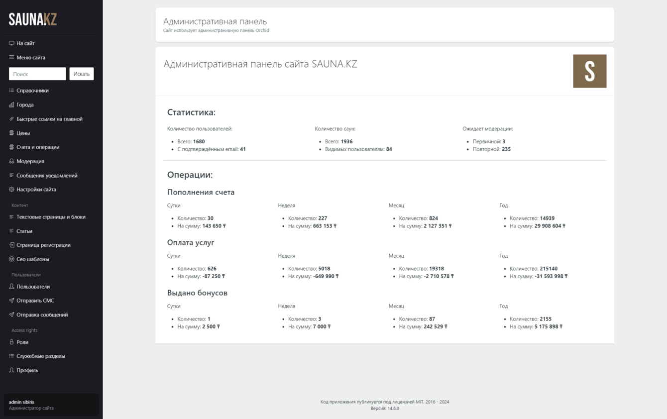 Старый сайт Sauna.kz — собственная разработка заказчика, где он сделал все «внутренности» сайта максимально кастомно и под себя: ясно, понятно, привычно. Поэтому уже на этапе продажи проекта было ясно: Битрикс для разработки не подойдет, т.к. его админ-панель не такая гибкая, её сложнее настроить под свои процессы. Поэтому мы выбрали фреймворк Laravel и админку Orchid. В админке сделали много кастомных страниц для модераторов, чтобы покрывать их типовые кейсы. Например, поиск по разным полям разных сущностей, массовые рассылки SMS, начисление бонусов, мини-CRM для работы с владельцами саун, модерация саун.