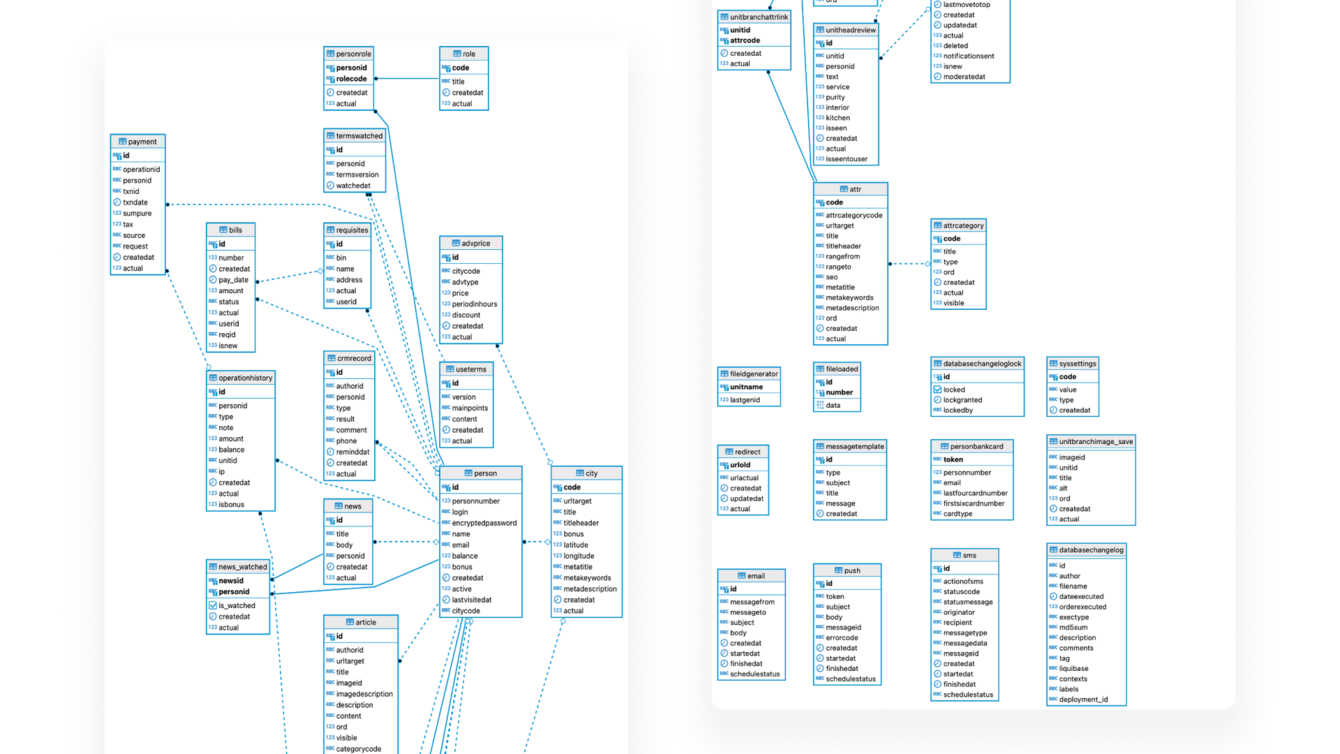 Чтобы всё распутать, мы сначала нарисовали большую схему со всеми взаимосвязями текущей базы от заказчика. А затем удалённо подключались к тестовой базе в Казахстане, писали код для импорта каждой таблицы и перетягивали данные к себе на сайт.