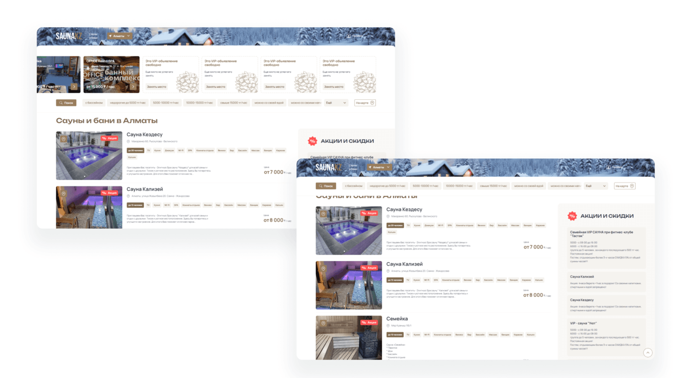 Секрет успеха сервиса Sauna.kz — в узкой специализации: на сайте в объявлениях указывается много специфической информации и используется подробный фильтр для поиска саун. Универсальные агрегаторы таким похвастать не могут: там часто указывается более обобщенная информация, что не всегда удобно пользователю.