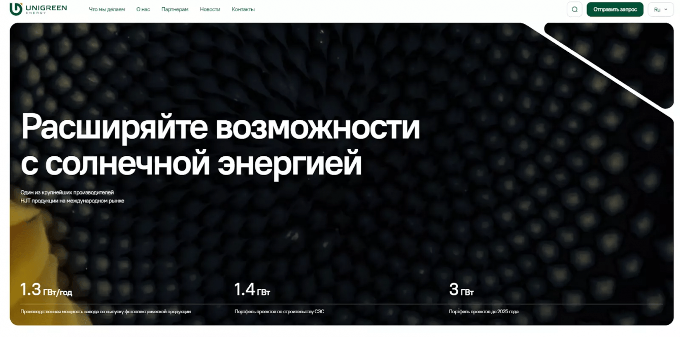 Гетероструктурная технология — ключевое преимущество Unigreen. Это современная технология производства ячеек, которая делает их более эффективными по сравнению с аналогичными моделями. Задачей дизайна сайта было подчеркнуть важность этой технологии, демонстрируя инновационность продуктов Unigreen.