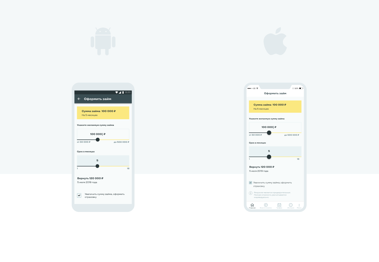 Сотрудничество с клиентом продолжилось разработкой дизайна приложения для Android и iOS. Для удобного сценария использования мы сделали поэкранную подачу информации, где заполнение заявки разбито на девять небольших шагов. Разработали быстрый доступ к ключевым функциям: редактированию данных и внесению платежей.