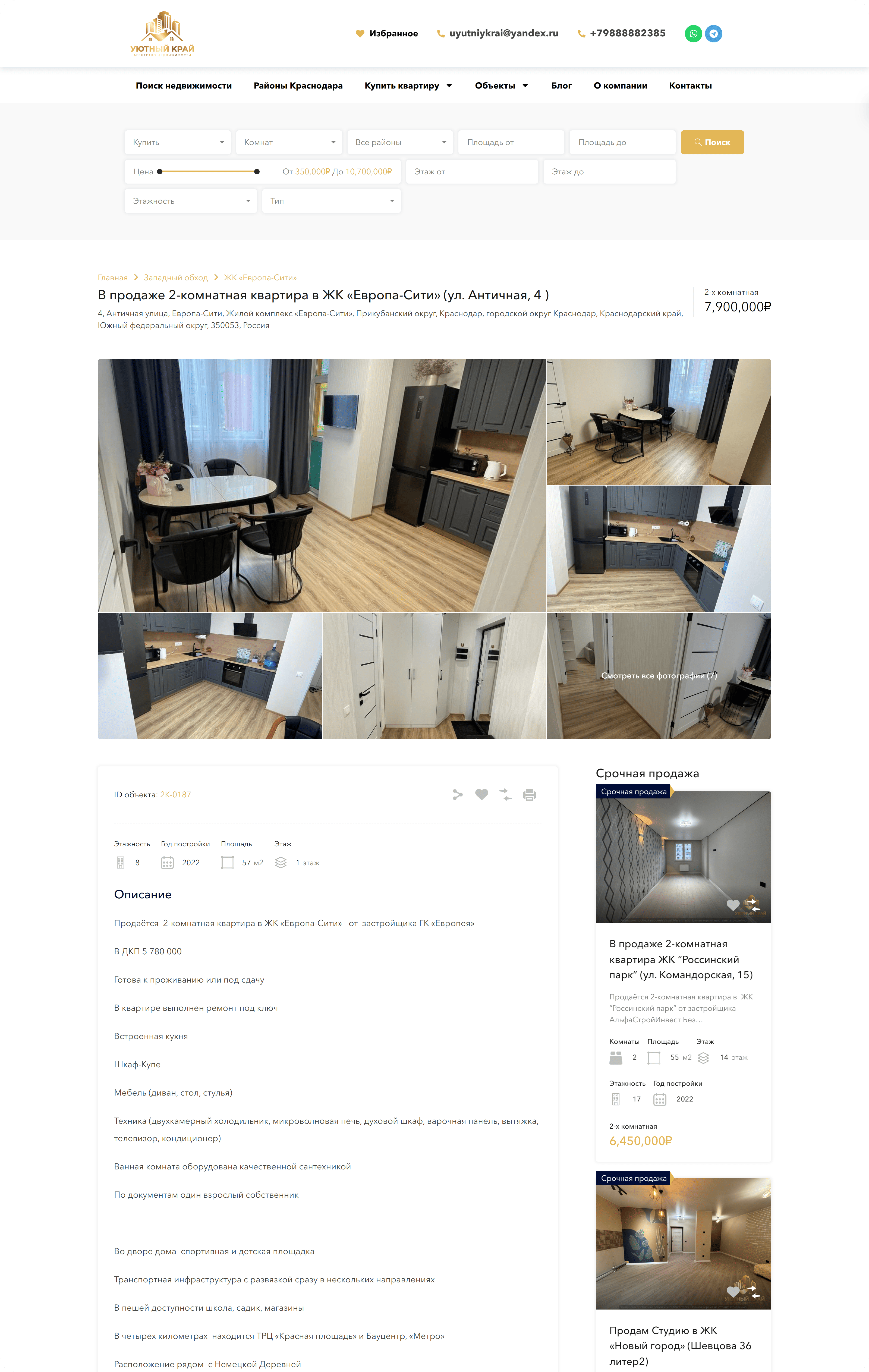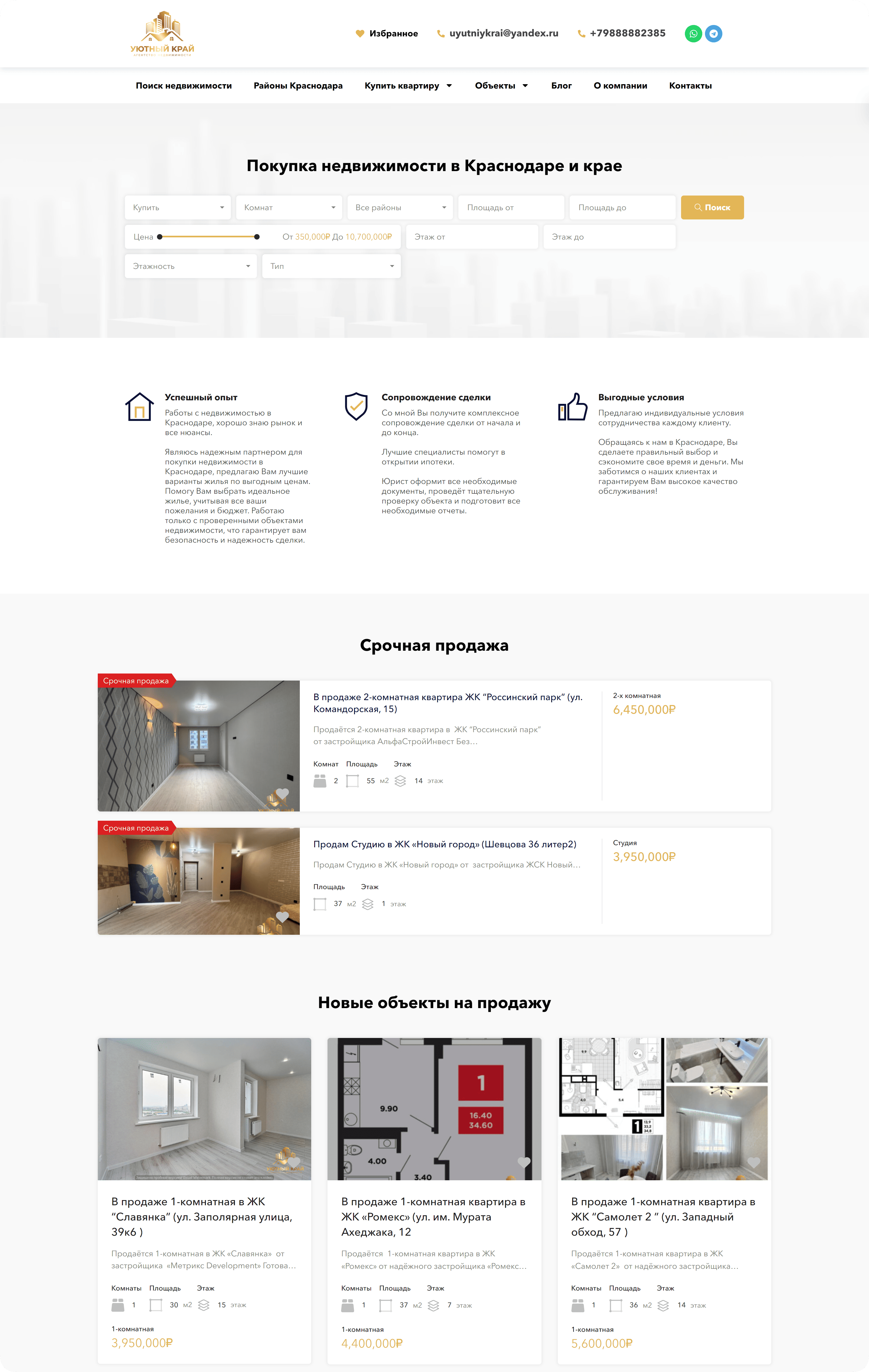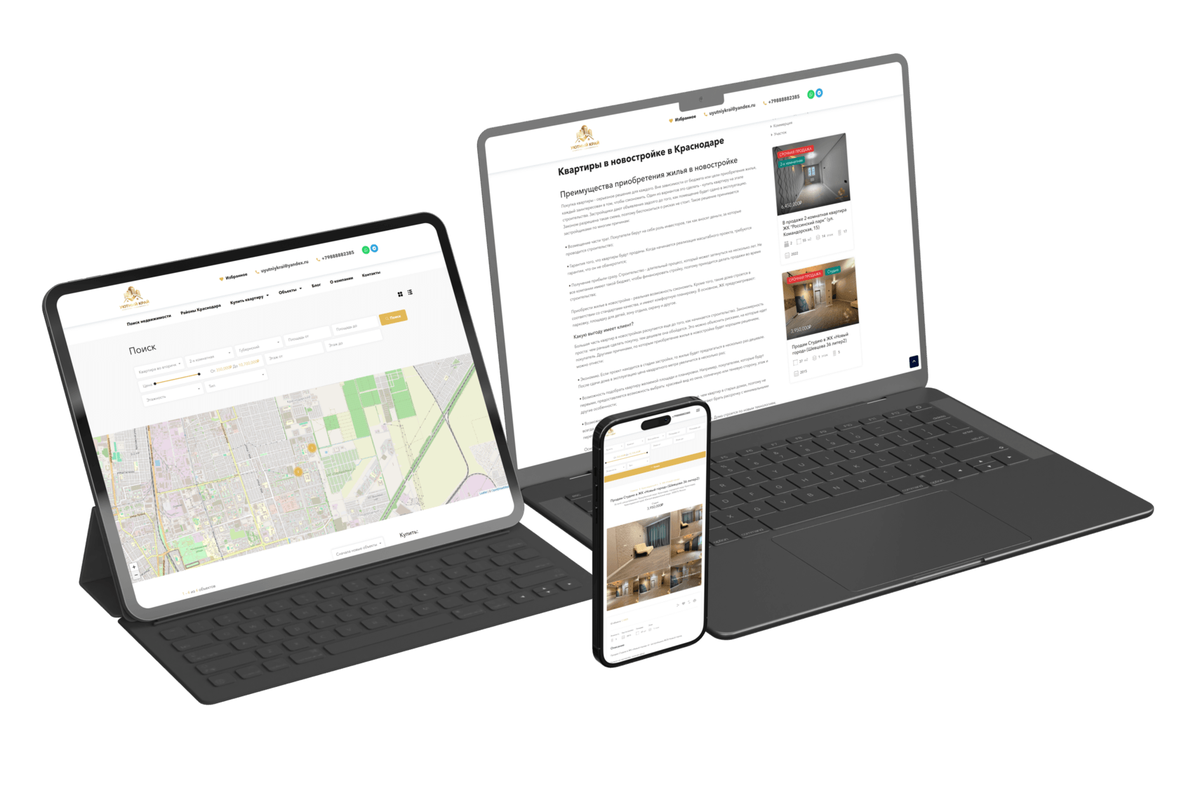 Перед нами стояла задача создать сайт для компании «Уютный край». И мы ее выполнили. Нам удалось разработать платформу, которая значительно упрощает поиск недвижимости в Краснодарском крае. Ее несложно открыть с телефона, планшета или ПК. Ведь она открывается и разворачивается на любых устройствах.