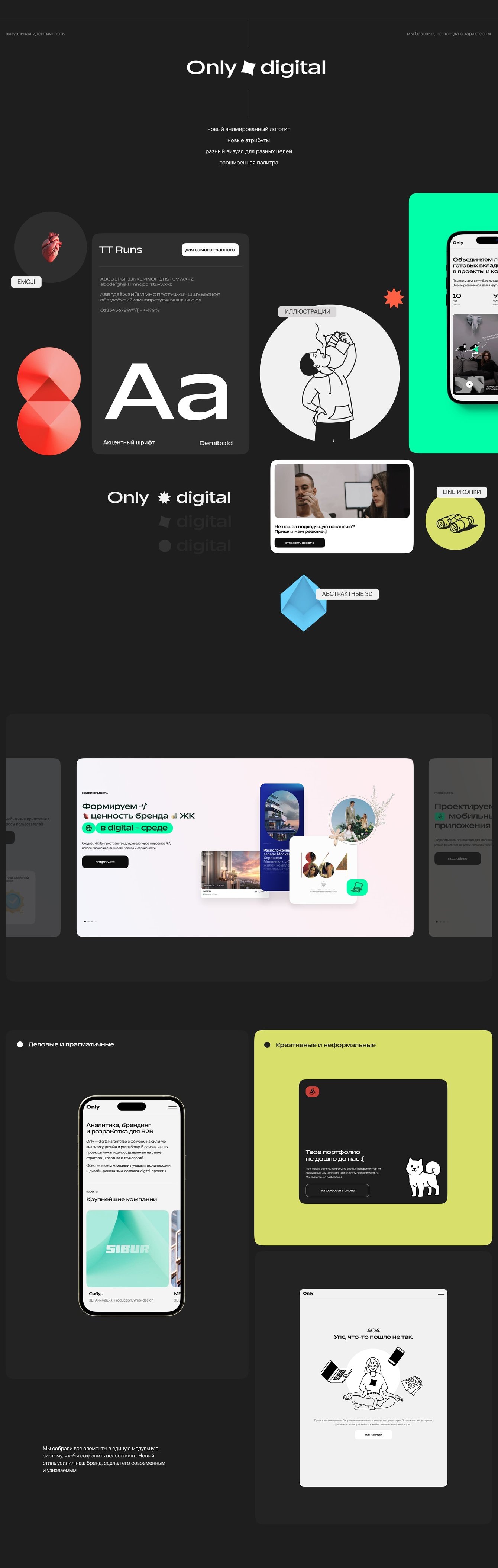 Раньше сайт Only был «монохромным холстом» для проектов, которые говорили за нас. Развитие компании привело к необходимости в собственном визуальном языке. Новый бренд и сайт — это сочетание ярких, но сдержанных оттенков, которые добавляют современности и подчеркивают индивидуальность бренда.