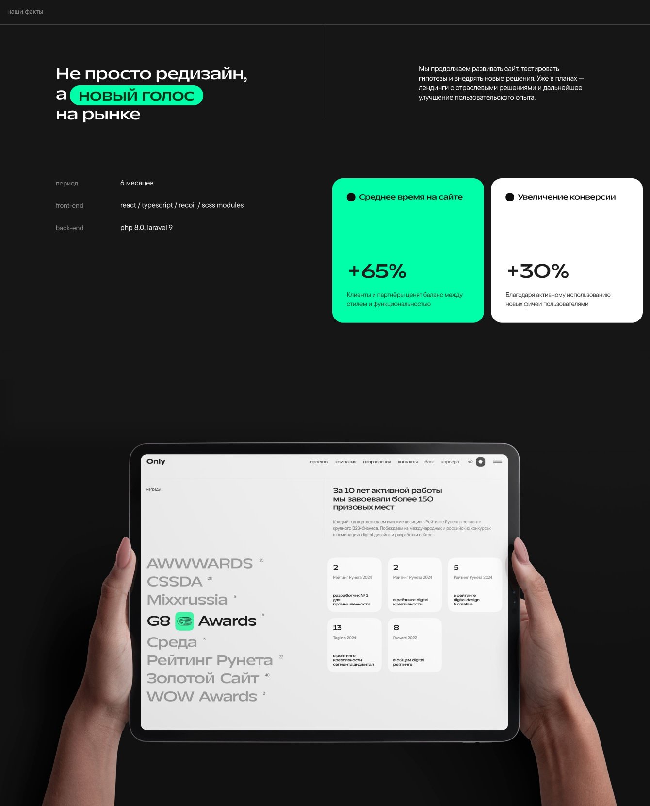 Only за 10 лет прошла путь от небольшой региональной веб-студии до диджитал-агентства на 100+ человек. Наши клиенты стали крупнее, проекты — сложнее, а старый сайт перестал соответствовать как нашим амбициям, так и ожиданиям аудитории.