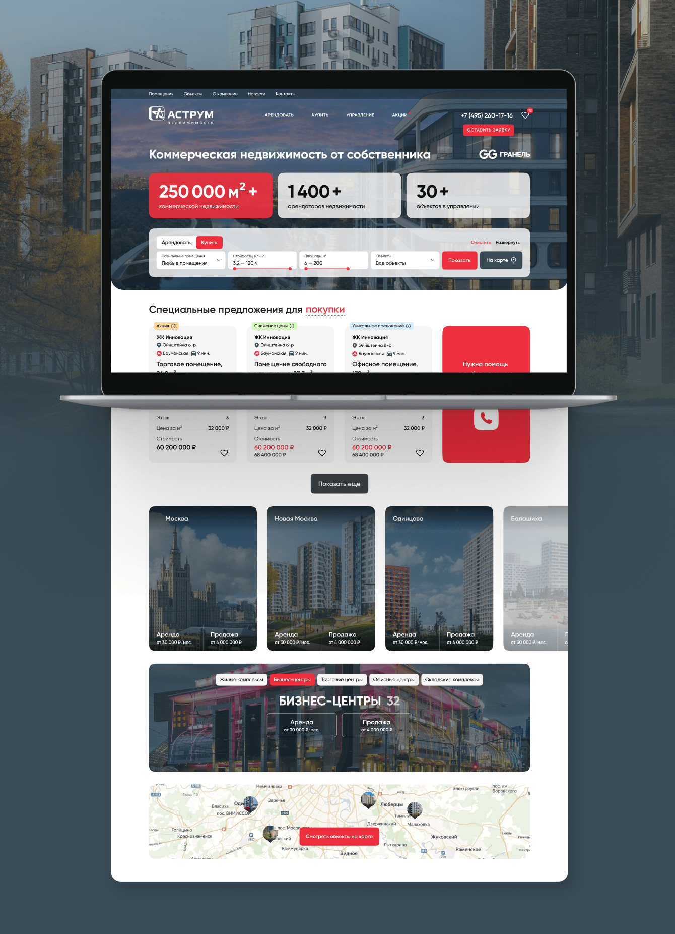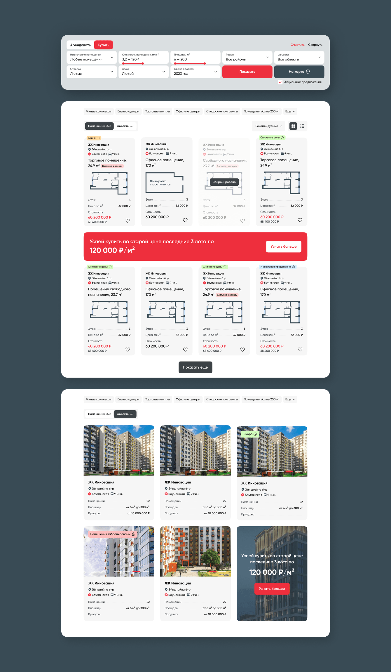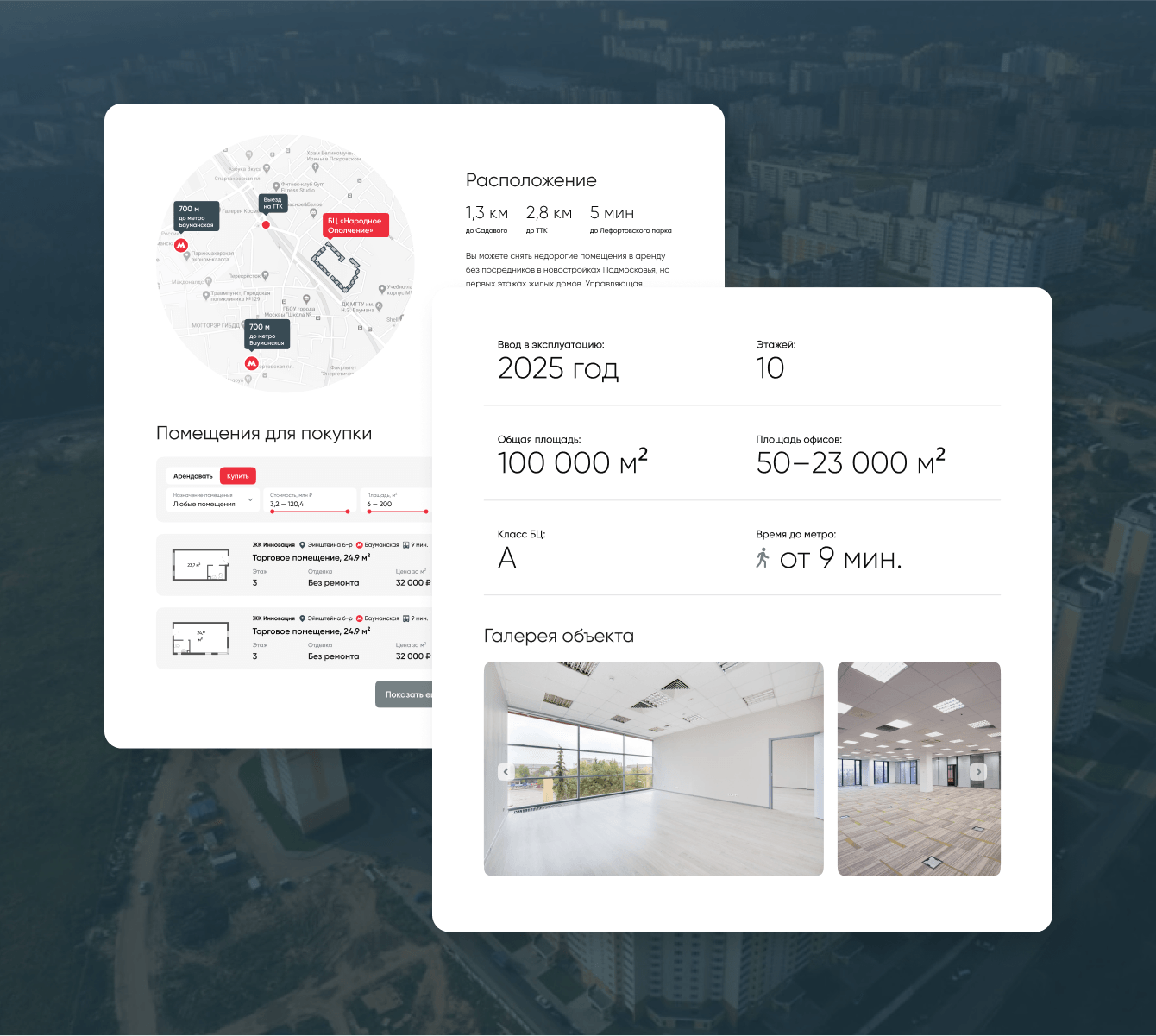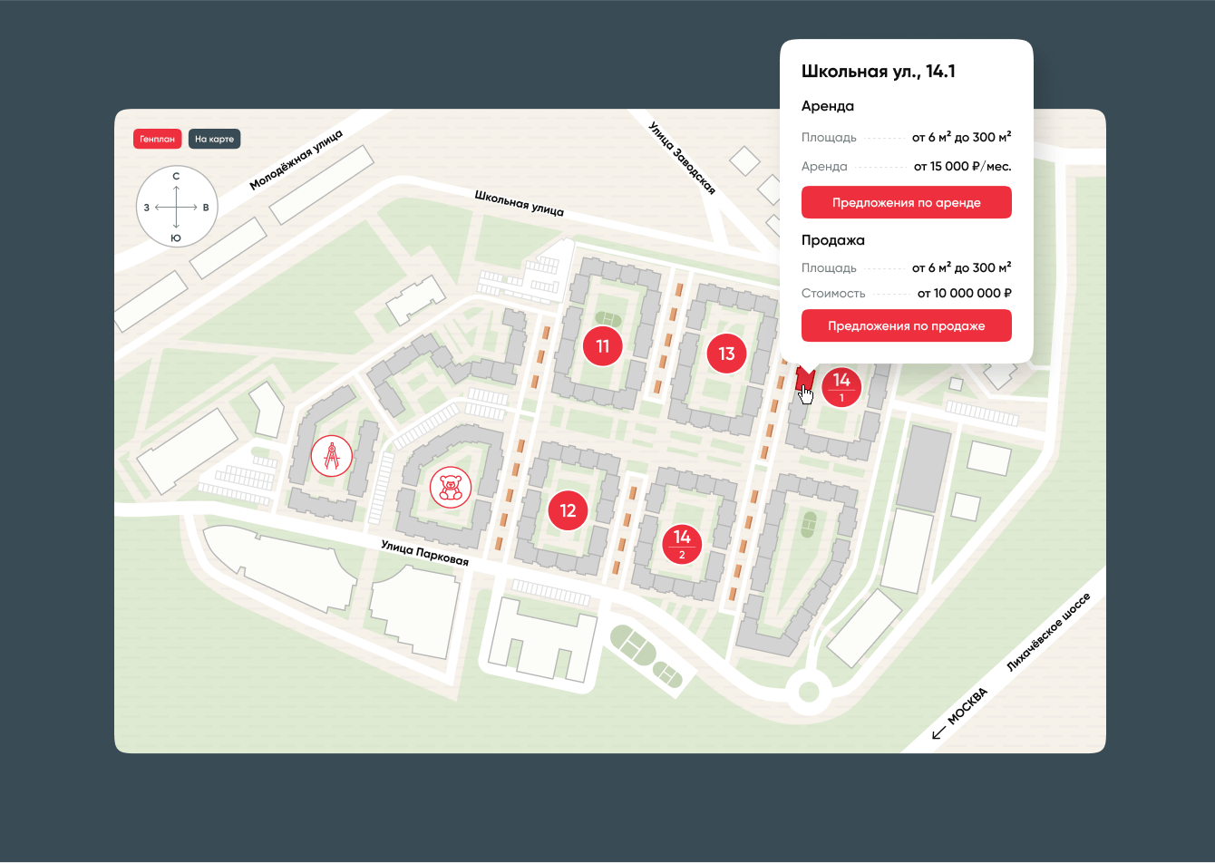 - Интегрировать интерактивные карты и генпланы, чтобы упростить выбор объектов по их местоположению;