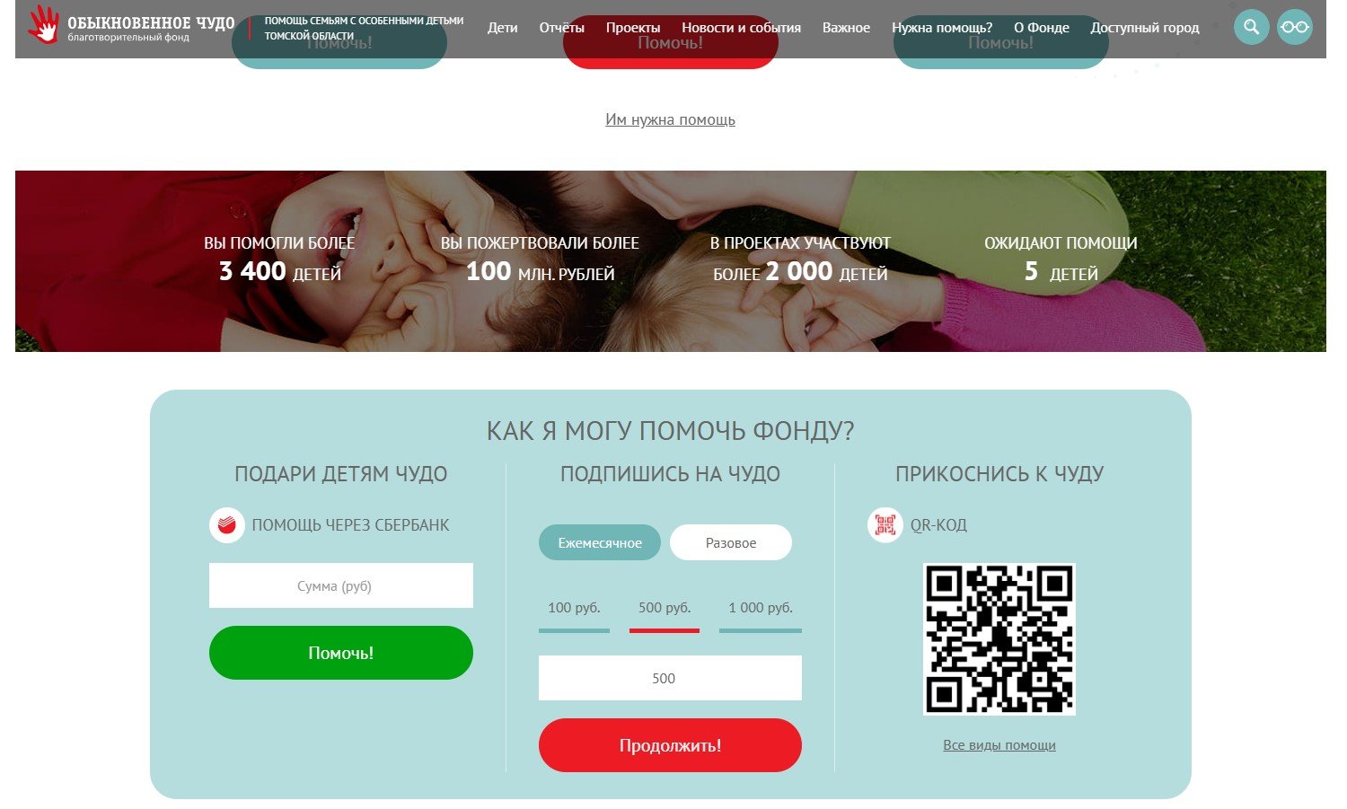 Заказчиком была поставлена задача - сделать красивый и функциональный сайт. Помимо прочего, "мягко" интегрировать в функционал и дизайн сайта кнопку "Помочь". К ней необходимо было подключить рекуррентные платежи, иные инструменты электронного перевода пожертвований.