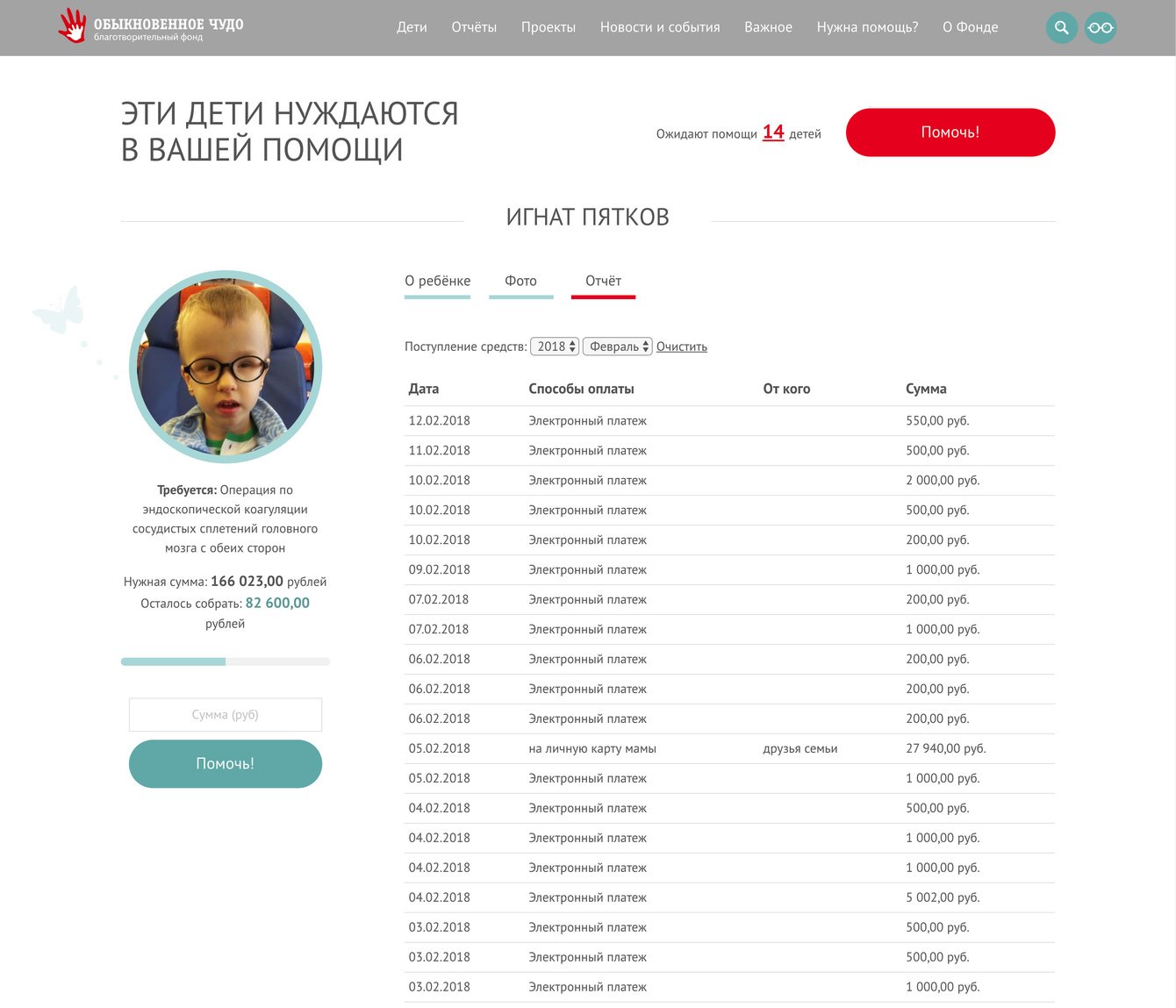 Важной для заказчика задачей при разработке была организация подключения платежной системы с условием переноса всех архивных платежей по всем проектам и профилям детей. Наличие на сайте отчетности поступлений от жертвователей — ключевой показатель деятельности любого благотворительного фонда, поэтому мы уделили особое внимание этой задаче: все архивные платежи и отчеты перенесены на новый сайт без потерь.