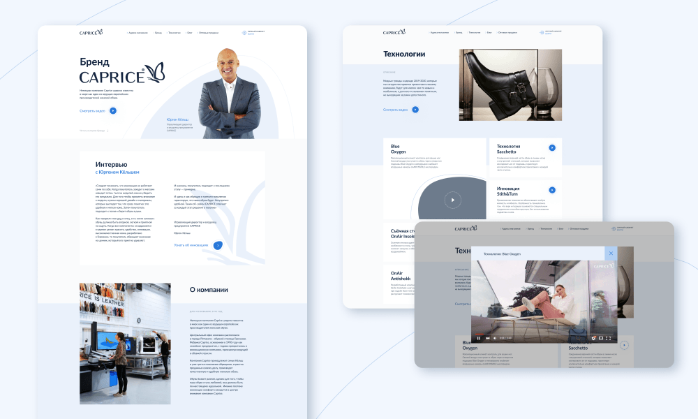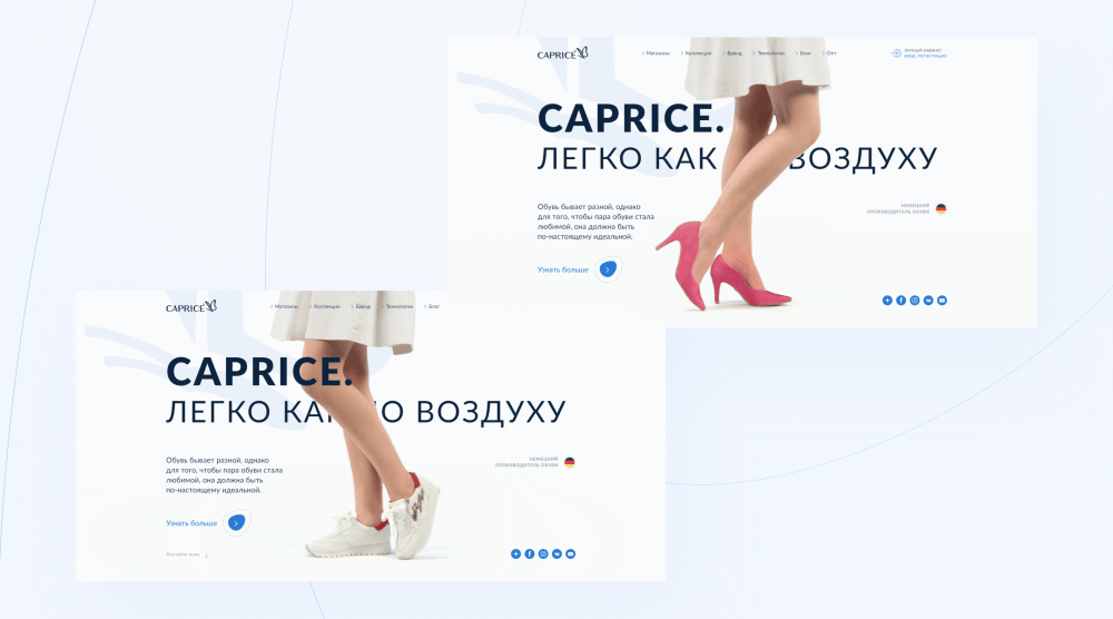 Легкость и воздушность передали через цвета, стилистику элементов и необычное видео на первом экране. Видео смонтировано и встроено в сайт так, что создается впечатление, будто девушка идет по воздуху в обуви Caprice.