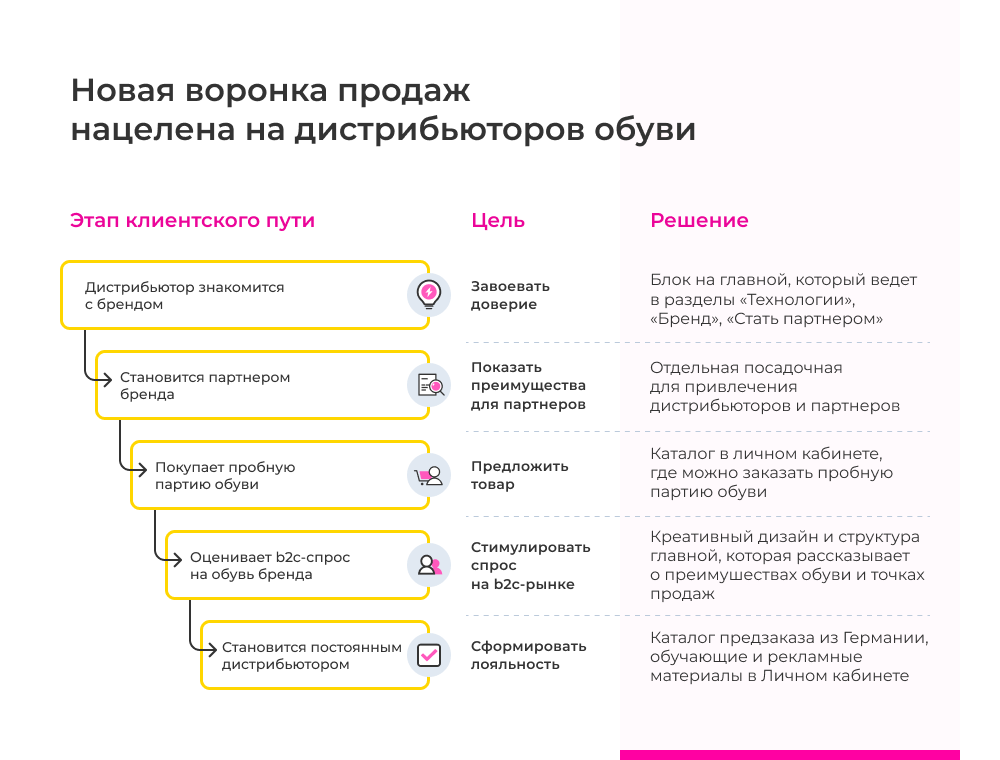 Тогда мы продумали реалистичную воронку продаж, основываясь на бизнес-процессах: сайт должен ориентироваться не только на B2C-сегмент, но и на дистрибьюторов обуви — тех, кто непосредственно покупает у российского представительства бренда.
