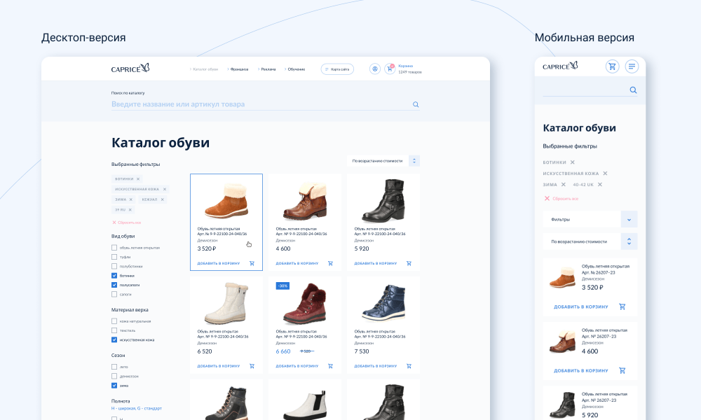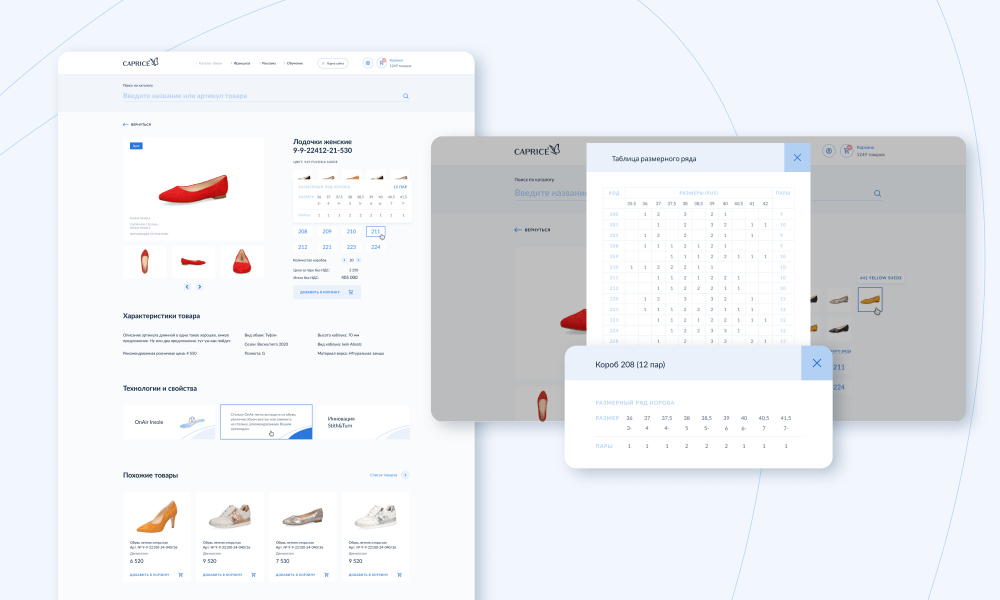 На сайте Caprice каталог реализован гибче: владельцы розничных магазинов сами решают, какие именно размеры им нужны, и самостоятельно формируют короба. Это создает конкурентное преимущество и снижает порог входа для новых дистрибьюторов при первичной закупке.