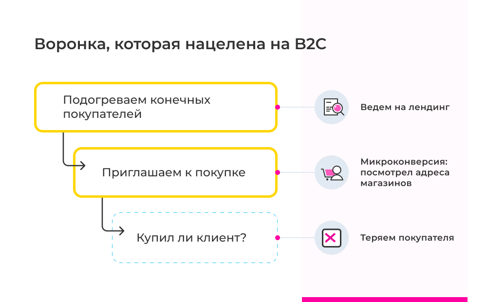 Сложность в том, что при продвижении только на B2C-сегмент невозможно оперативно отслеживать эффективность кампании, ведь непосредственно сделка происходит на стороне независимых дистрибьюторов.